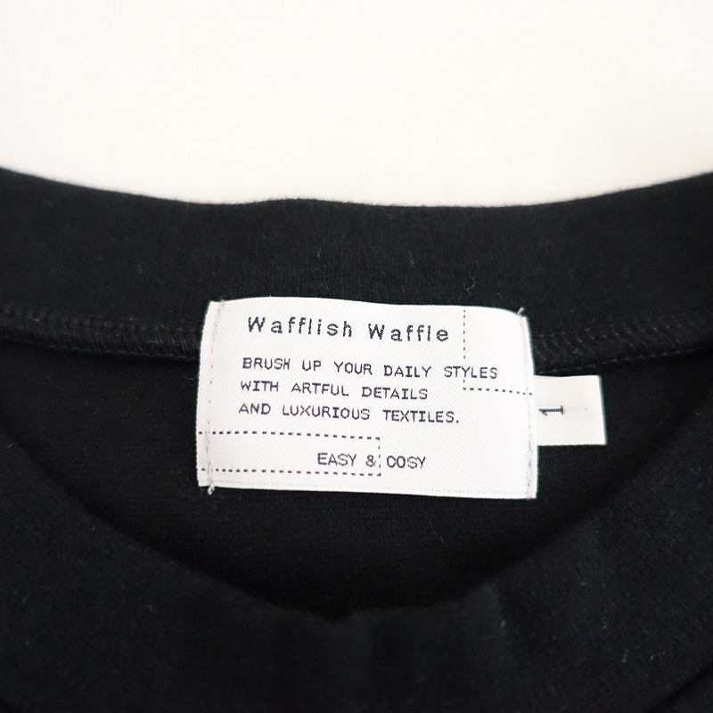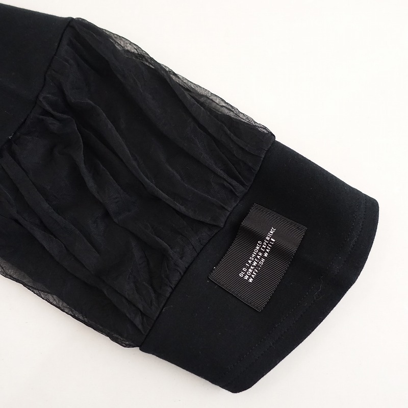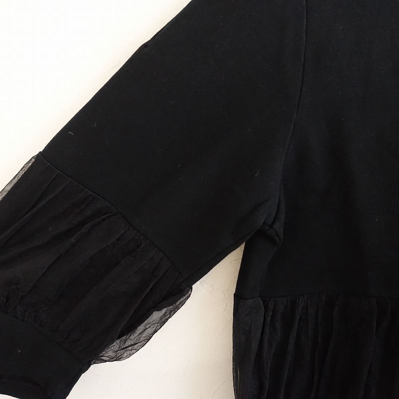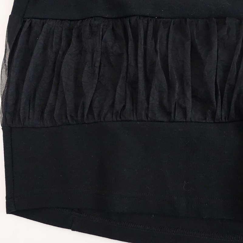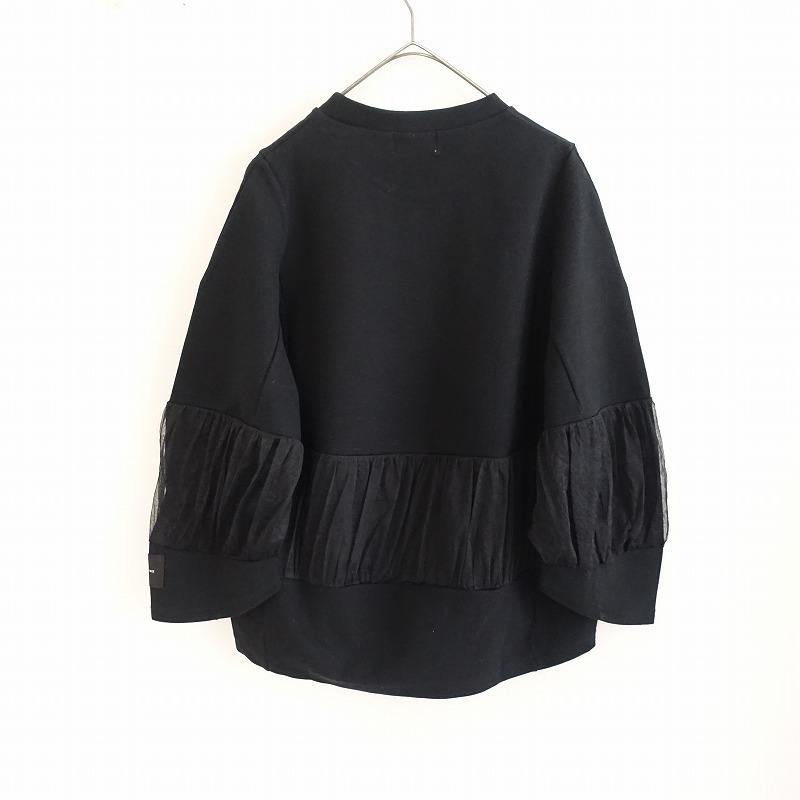 WAFFLISH WAFFLEのチュール使いプルオーバーです。カラーはブラックで、ストレッチ素材です。袖口周り&裾周りはギャザー入りのチュール地に切り替えられており、プルオーバータイプで着脱できます。 |