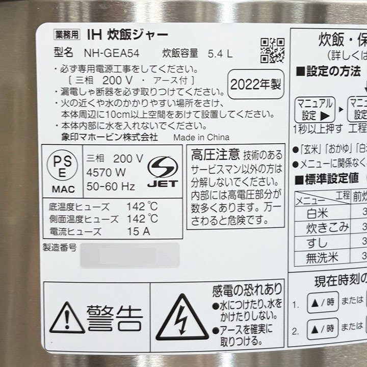 象印 IH炊飯ジャー NH-GEA54 3升 1.8~5.4リットル 三相200V専用 2022製 業務用 中古 厨房機器 調理機器