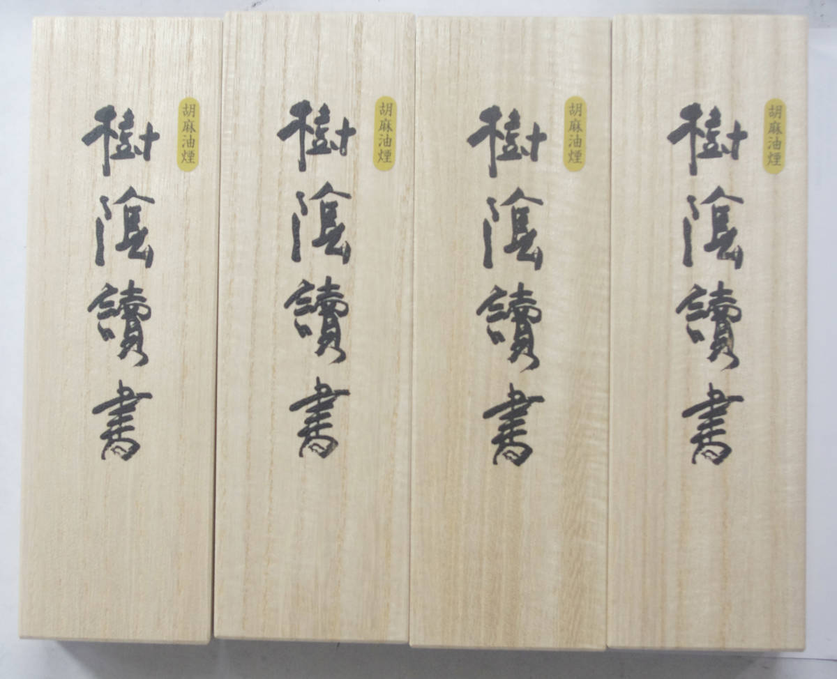 大型 胡麻油煙製「樹陰読書」4本セットの出品です。 大変光沢のある漆黒が特徴で特に 濃墨での墨色は魅力的です。 サイズ 約縦172mm横40mm 厚さ10mm 重量 約80g 新品未使用の桐箱入りです。 土日は発送及び取引連絡はしておりません。