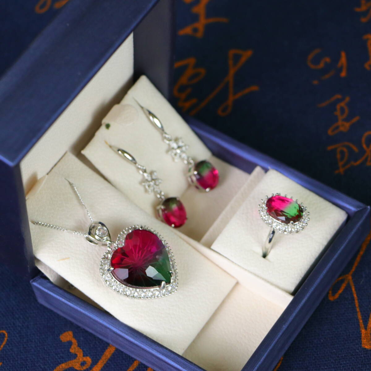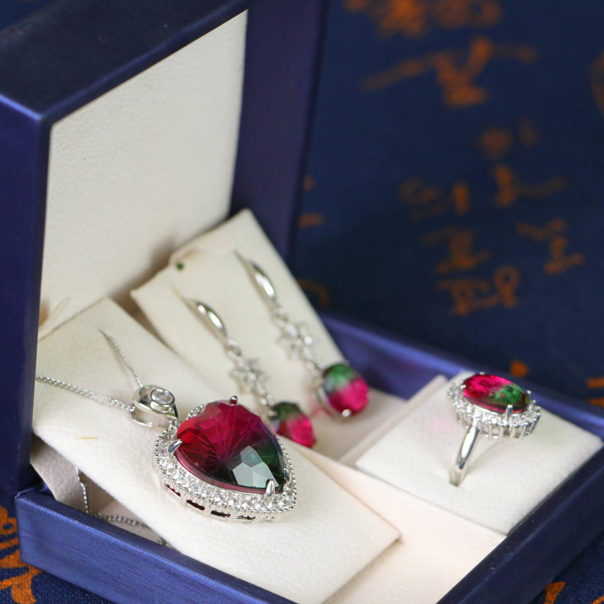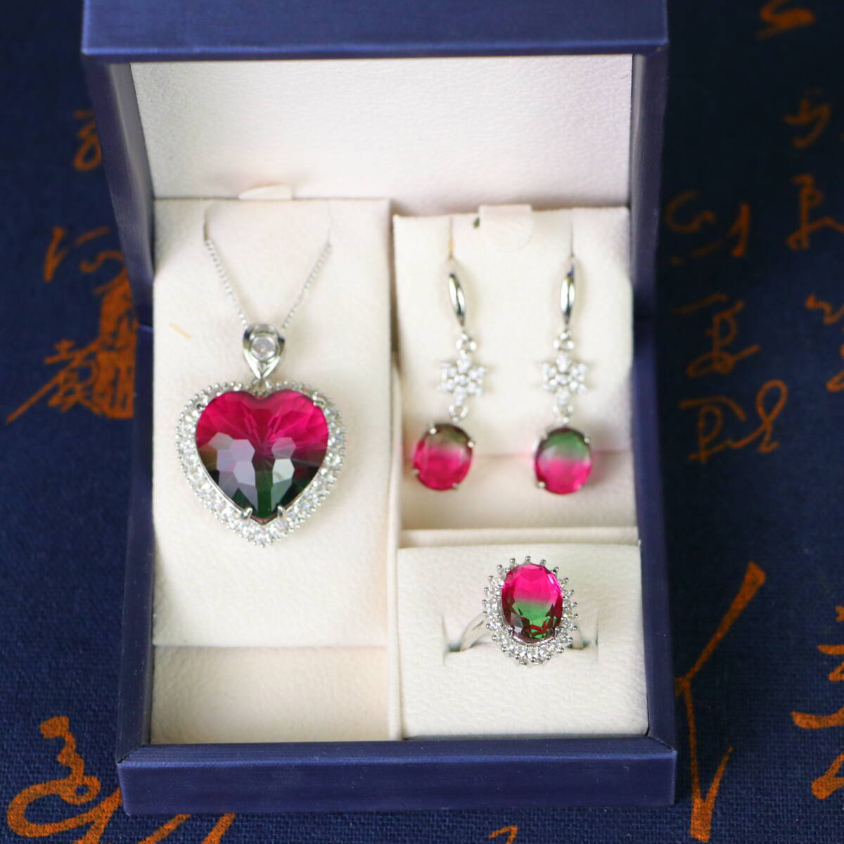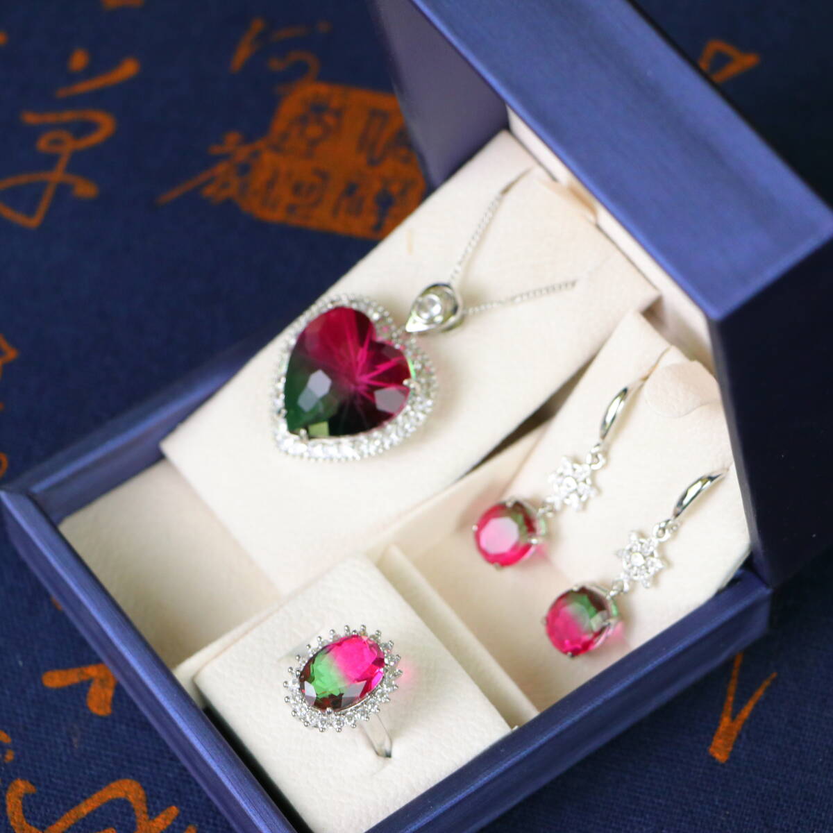 清時代 宮廷御供 高氷 宝石彫 漸変宝石 心形 耳飾 指輪 首飾 三件套 古擺件 時代物 古董品 骨董 收集 旧家蔵出し 唐物 中国古玩 古美術品