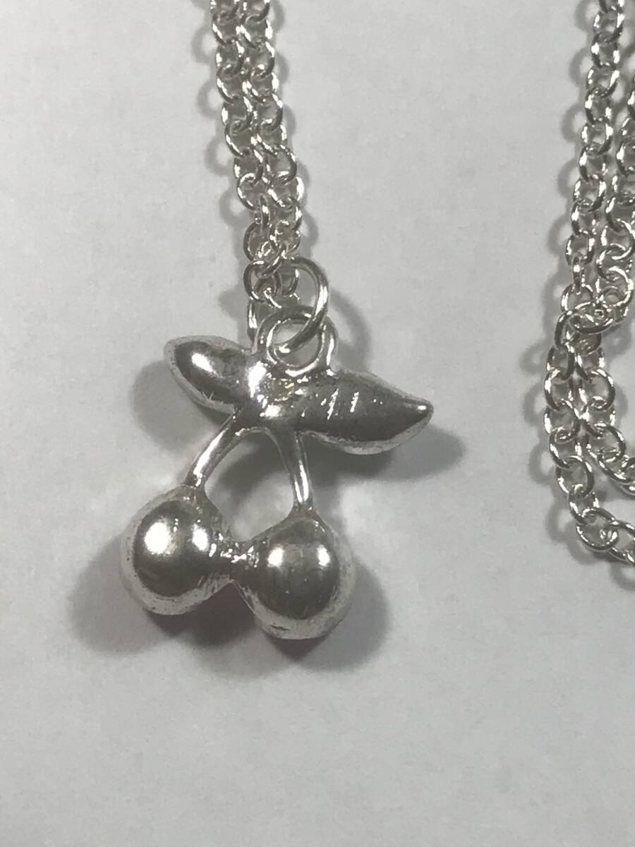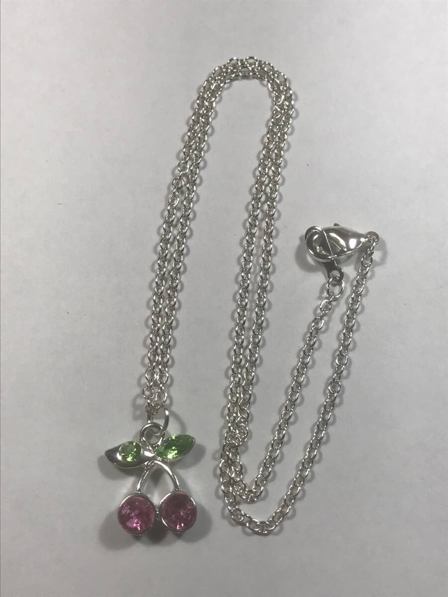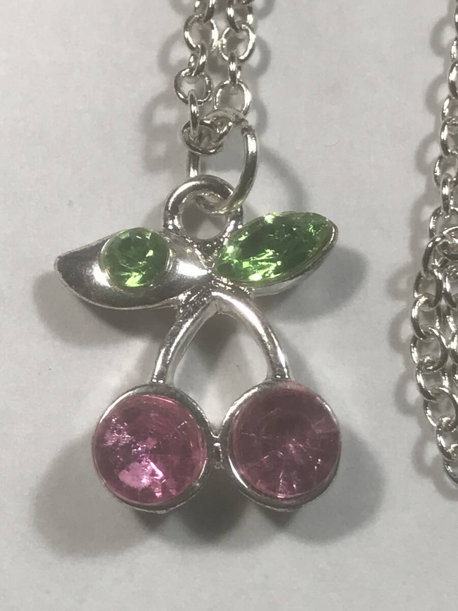 さくらんぼネックレス ピンクストーン×グリーンリーフ キュートな果実モチーフ シルバーチェーン