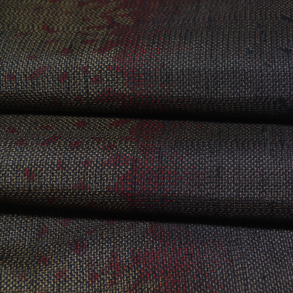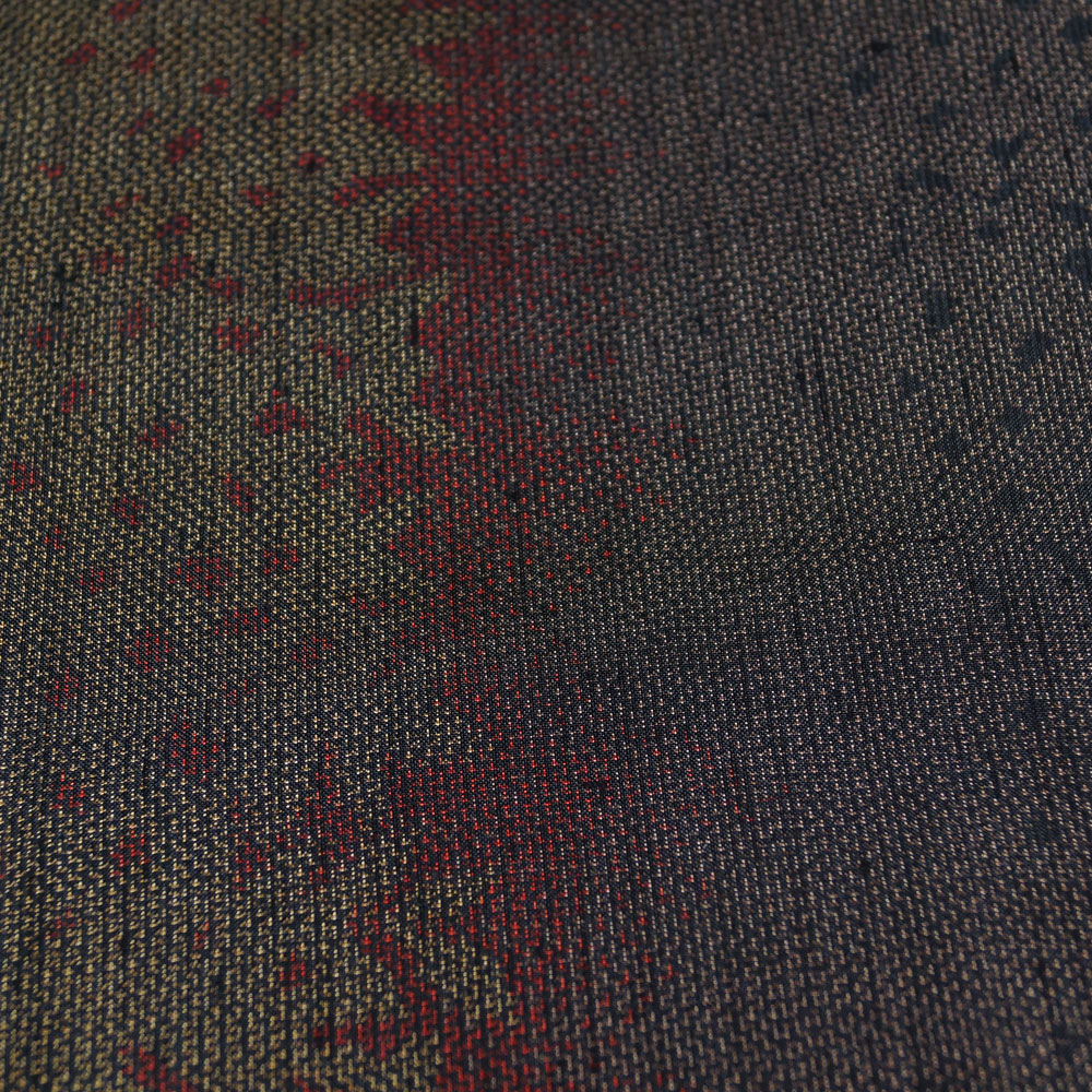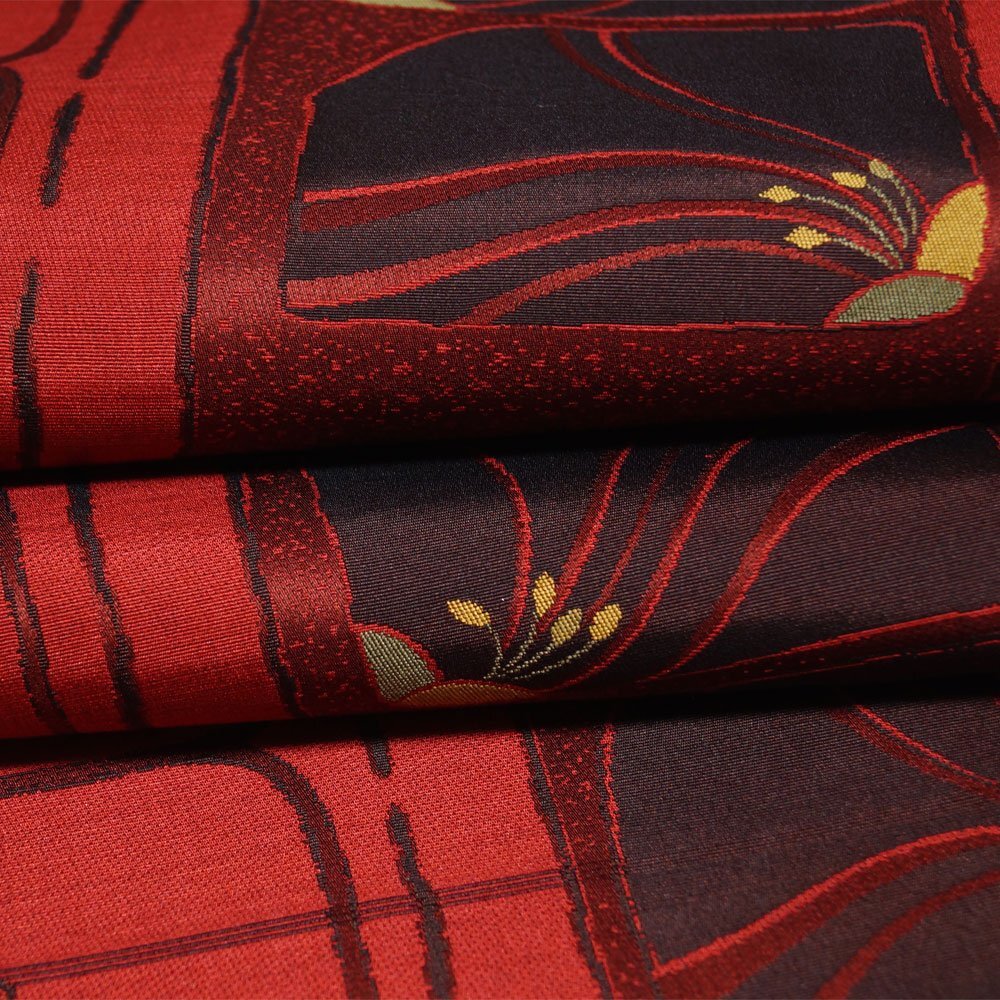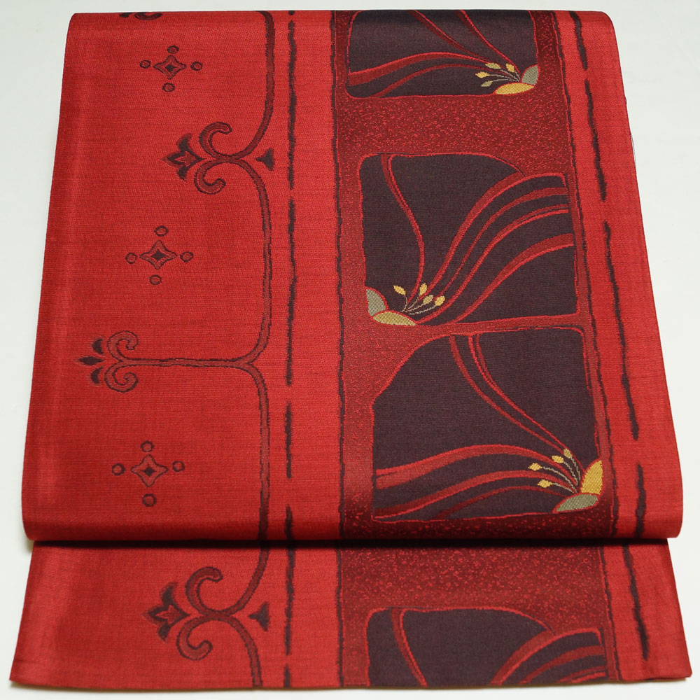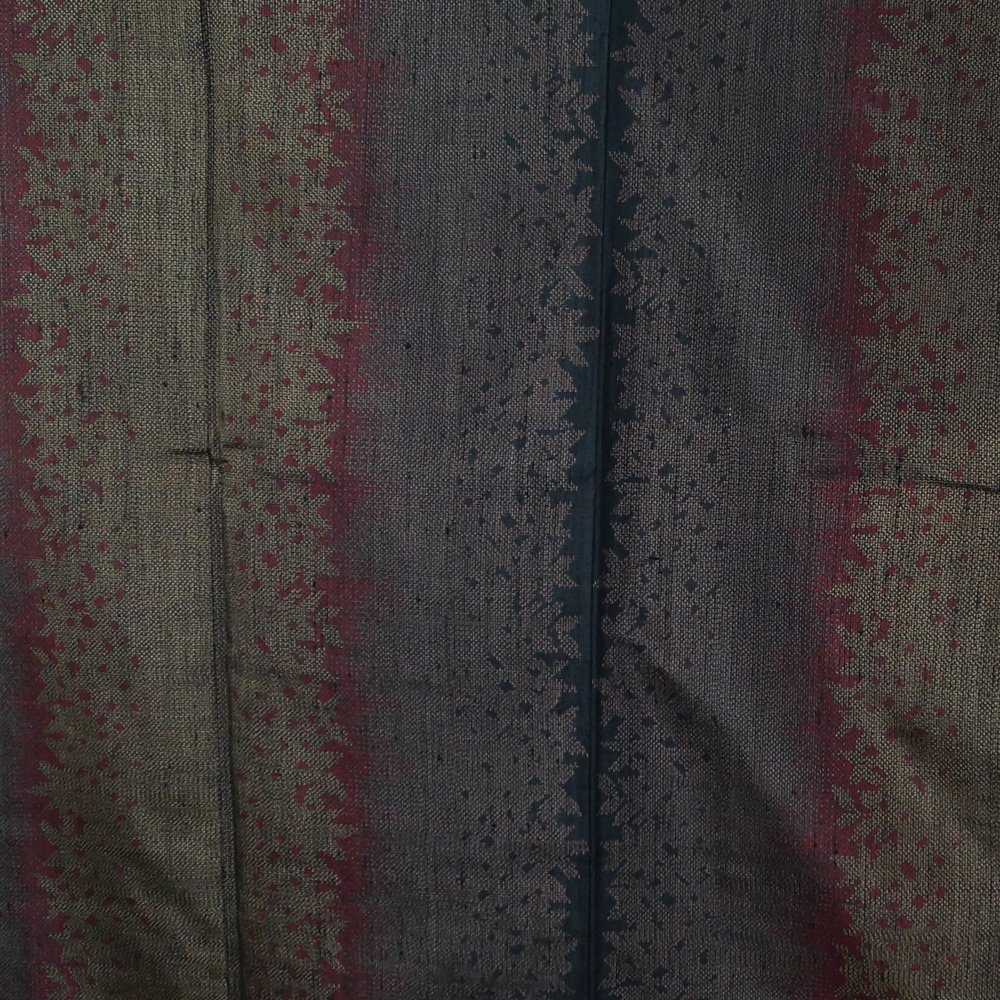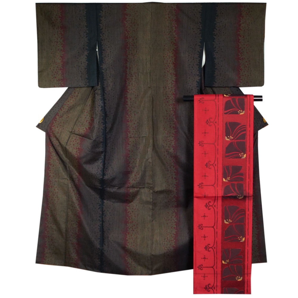 | 商品説明 | 織節のある黒色系の地に枝葉模様のシルエットぼかしが織られた紬と、臙脂色系の地に取方に洋花、更紗模様が織られた洒落袋帯の2点セットです。 | ||