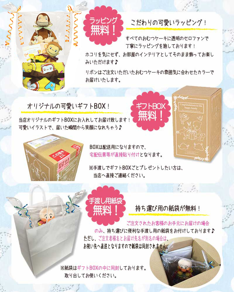 ・ラッピングに使用致しますリボンの色・お花の色・おむつケーキのデザインは弊社スタッフがコーディネートさせて頂きます。 ・商品本体の破損やご注文と異なる商品が届いた場合を除いて、お客様のご都合による商品交換、返品は衛生上お受けしておりません。 ・商品はデジカメ撮影をしておりますので、お使いのPC環境等により画像の色が実物と多少異なる場合がございますが予めご了承下さいませ。 |
