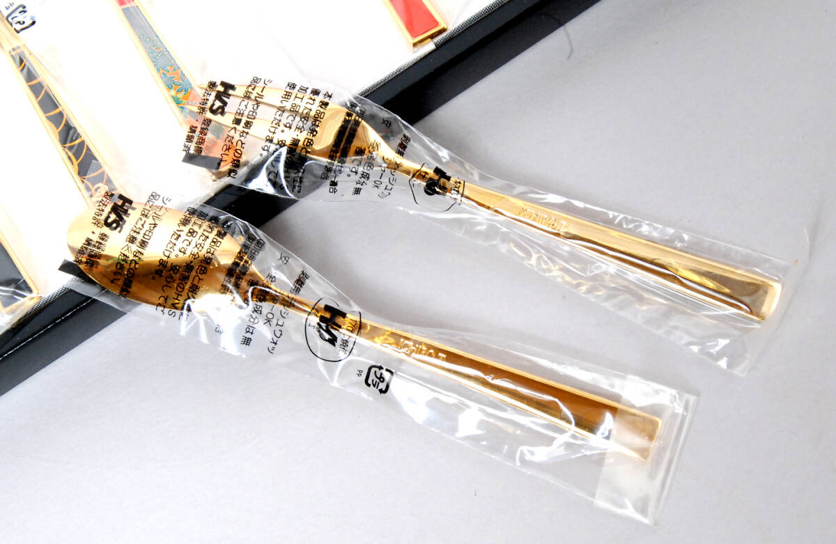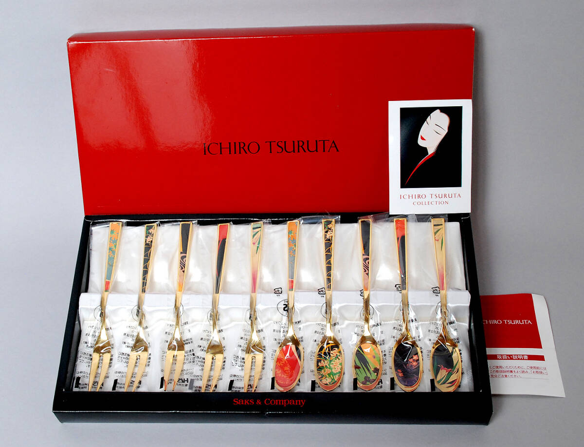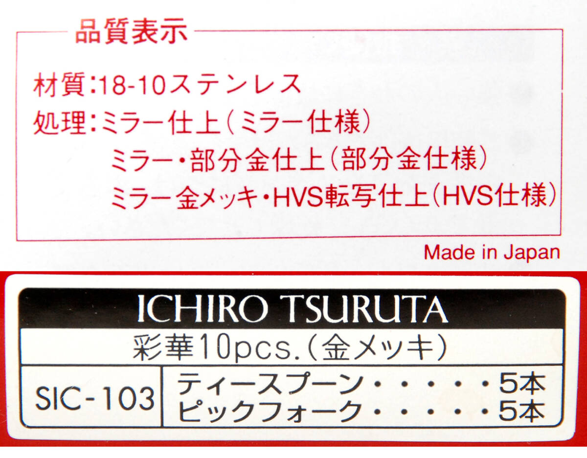 | * 商品説明 * ICHRO TSURUTAのティースプーンとピックフォーク5本づつのセットです。長さは約14cmです。18-10ステンレスに金メッキ仕上げです。赤い箱に入った未使用品です。ぜひお役立てください。 |