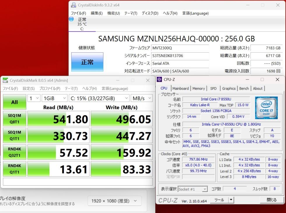 | CPU: 超高速 Intel 高性能 八世代Core i7-8550U 1.8Ghz、 4コア8スレッド (ターボ・ブースト利用時の最大周波数 4.0GHz) |