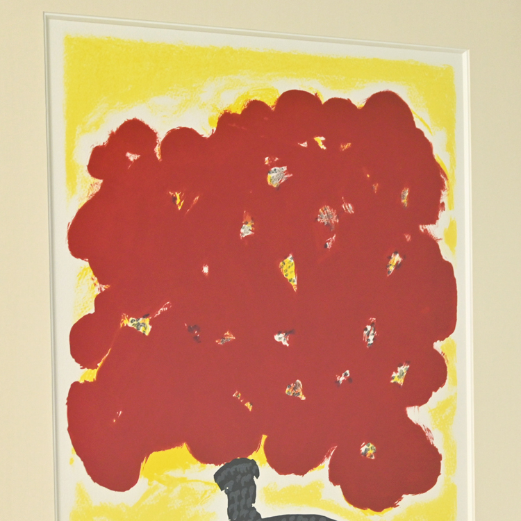 赤い花は、氏が生涯にわたって描き続けてきたモチーフ。黄色の背景に鮮やかな色彩が映えています。