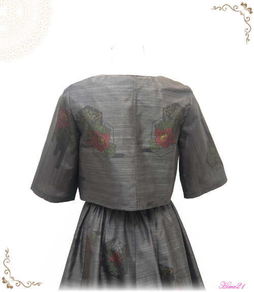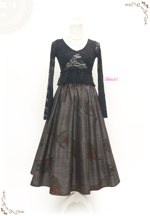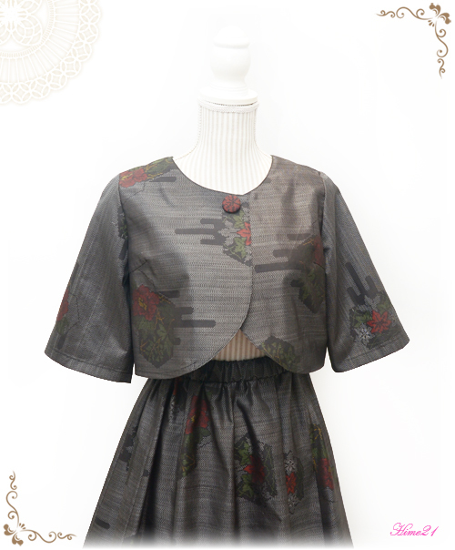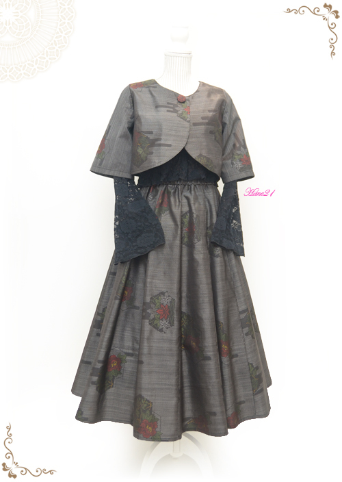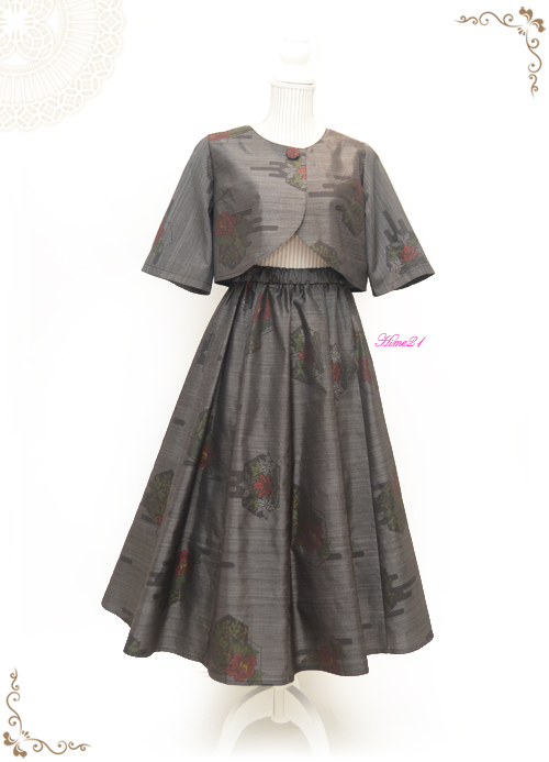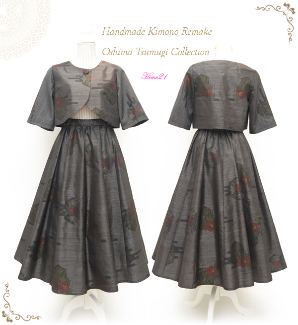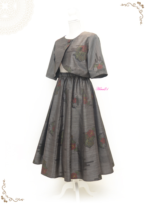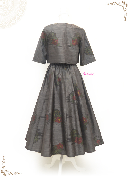 【大島紬】セパレートドレス★フレアースカートとボレロの上下セット(グレー系に花模様)着物リメイク*シルク*絹100 tsu972