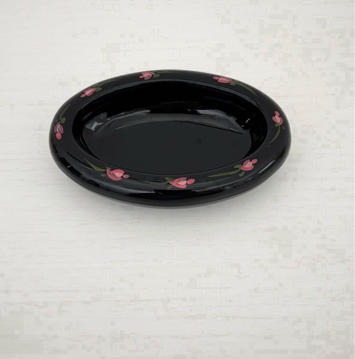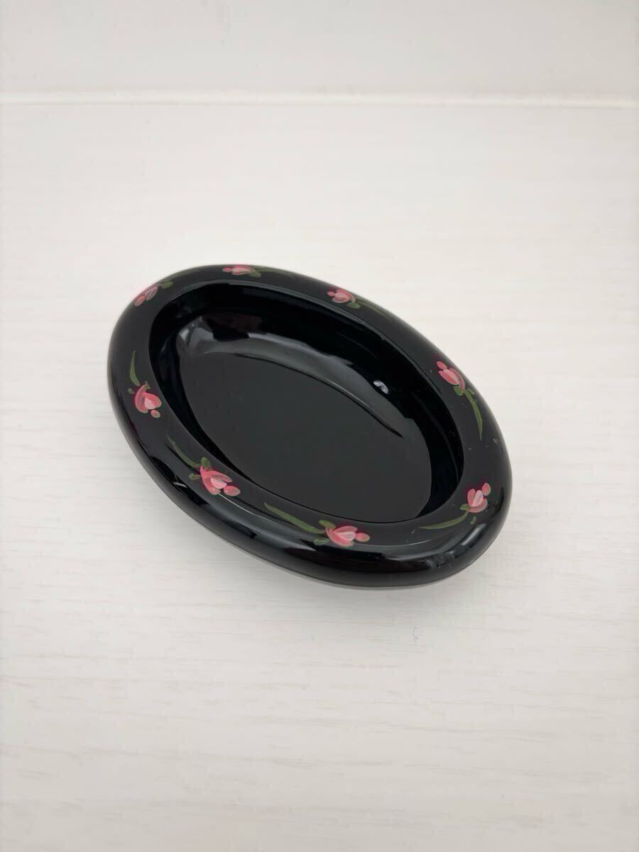漆黒の艶のあるガラスに可愛らしいピンクのお花がハンドペイントされたムラノガラスの小皿のご紹介です。