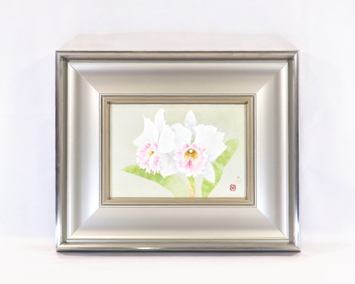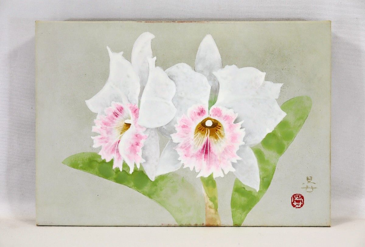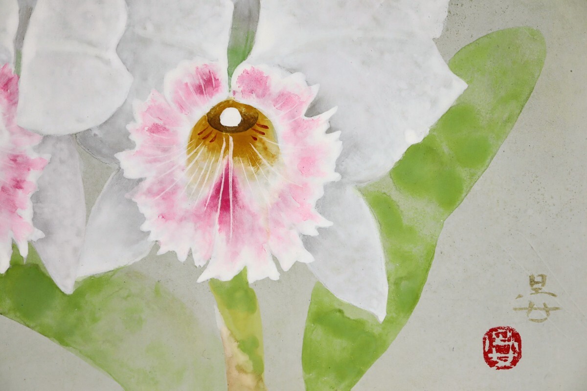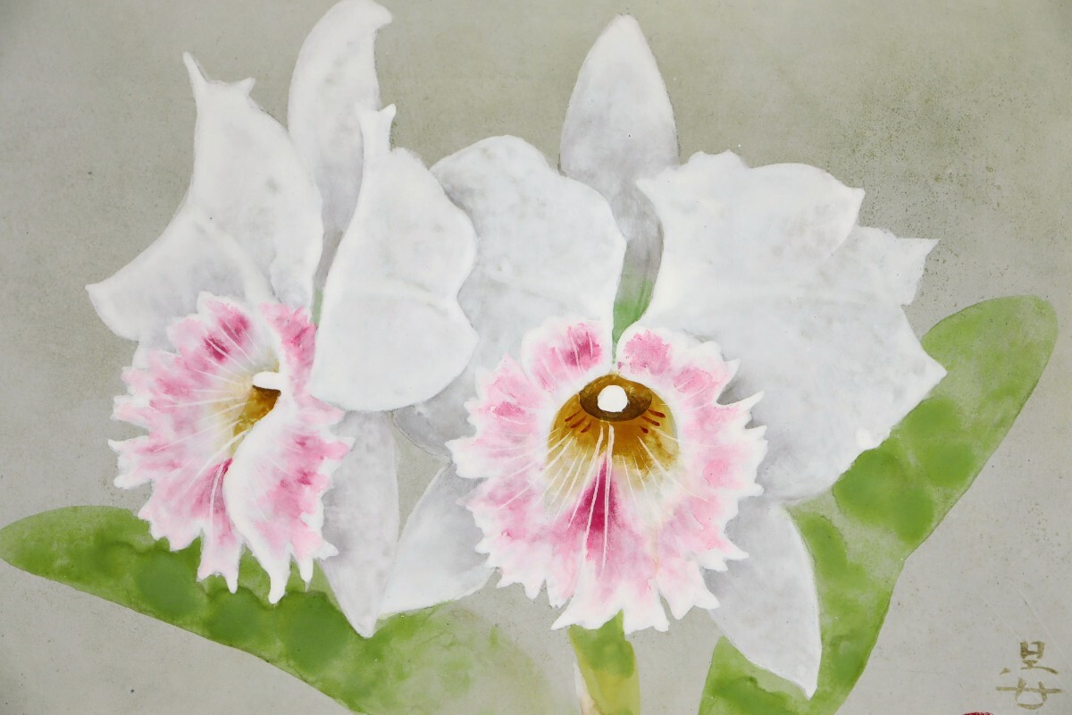 真作 沼田晏宏 日本画「洋蘭図」画 SM 京都府出身 日展会友 池田遥邨に師事 品ある流麗な筆致で丹念に描く 乳白色の瑞々しいカトレア 11012