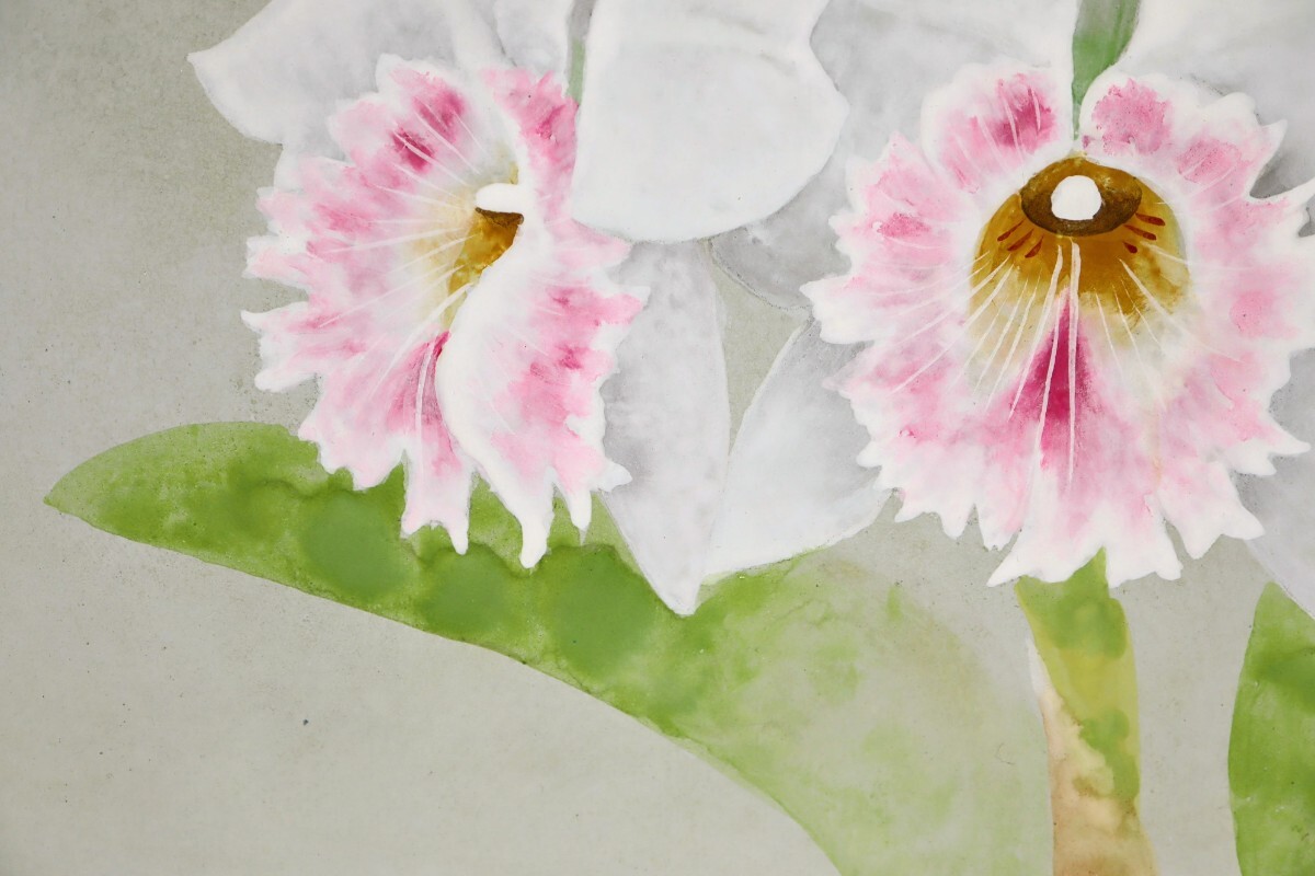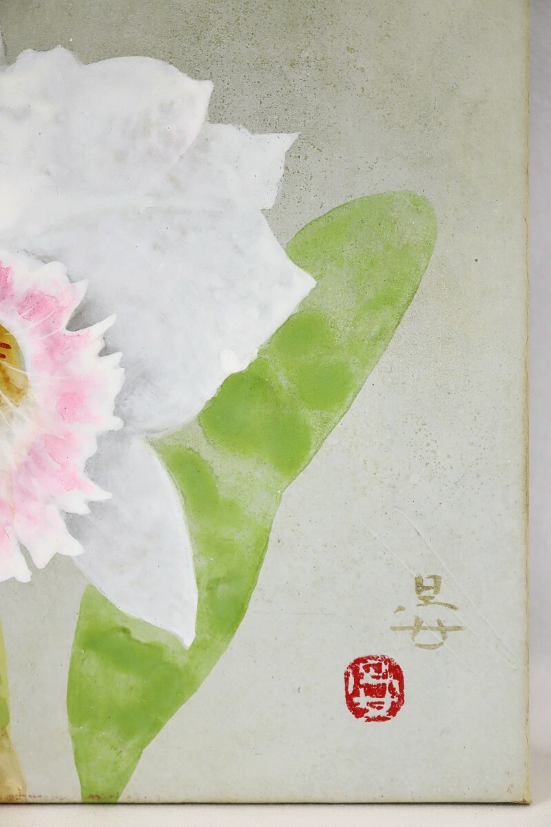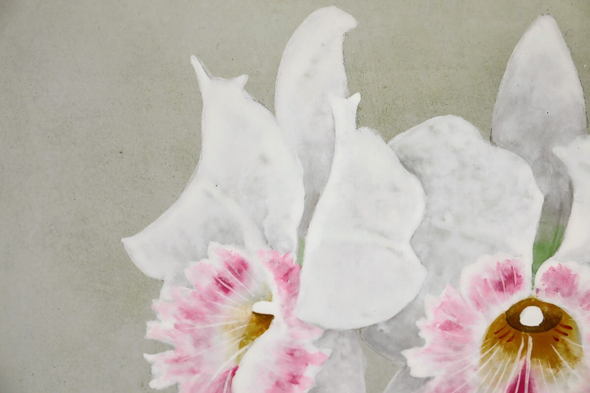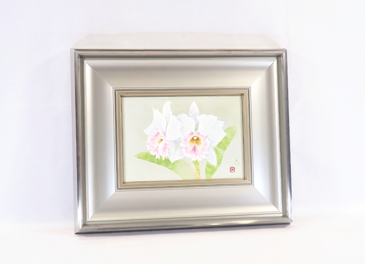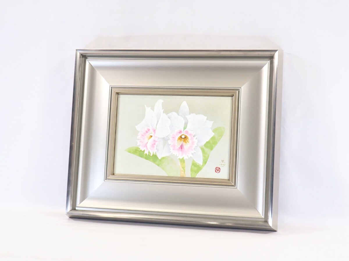 真作 沼田晏宏 日本画「洋蘭図」画 SM 京都府出身 日展会友 池田遥邨に師事 品ある流麗な筆致で丹念に描く 乳白色の瑞々しいカトレア 11012