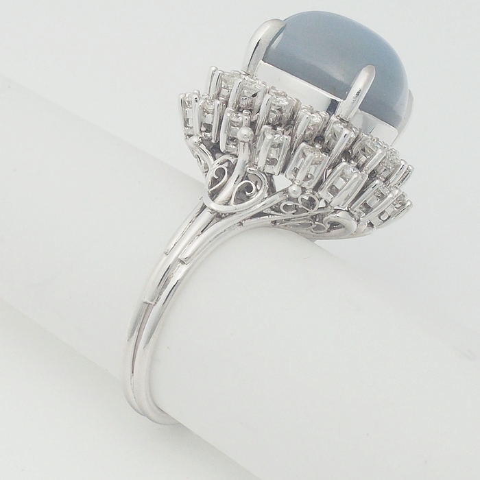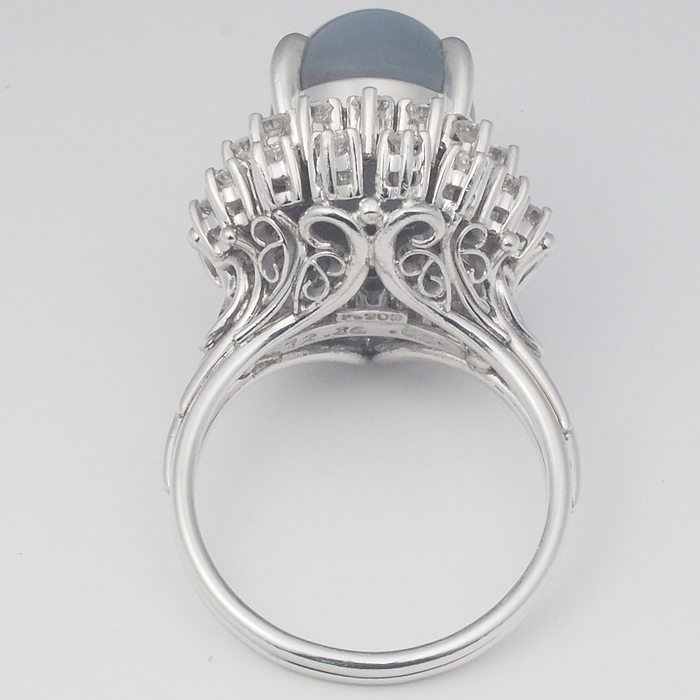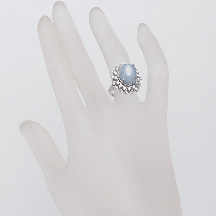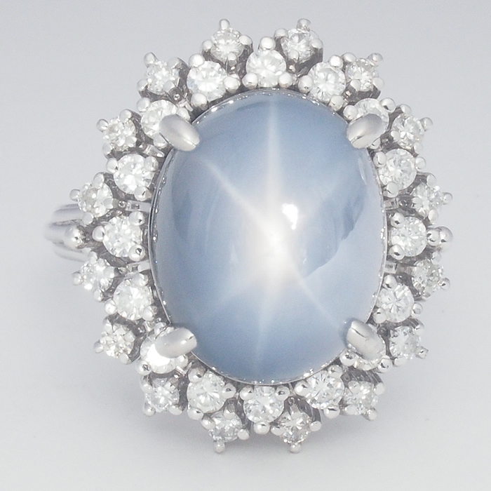 光が当たると星が輝く神秘的な石で、大変希少な石です。取り巻きのダイヤモンドも贅沢なリングです。