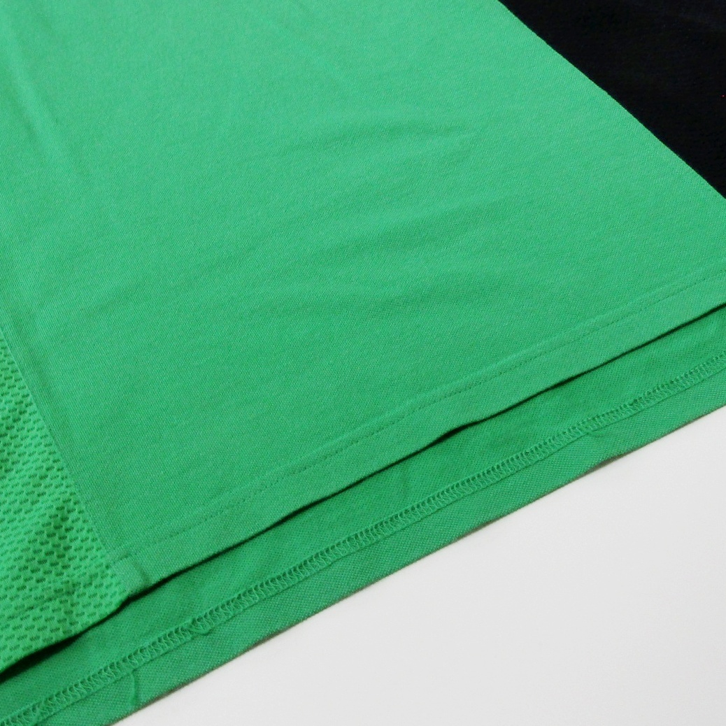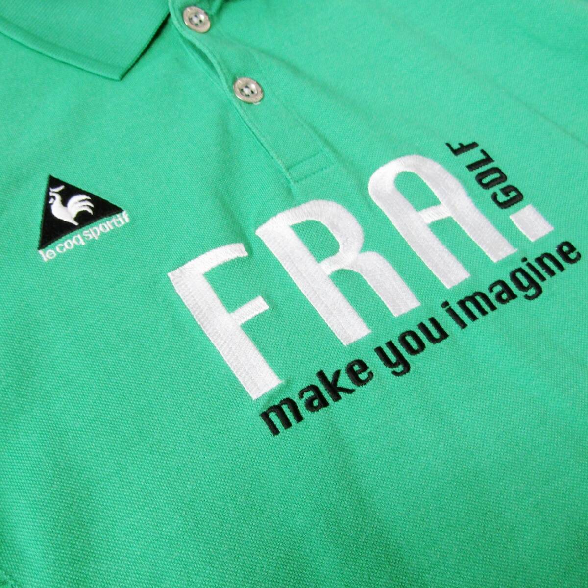 メッシュ素材のグリーンポロシャツ、FRA golfロゴ付き。