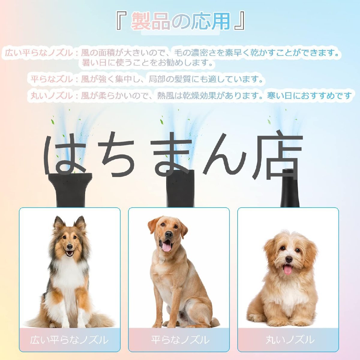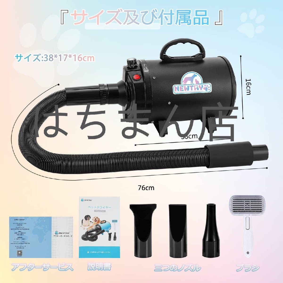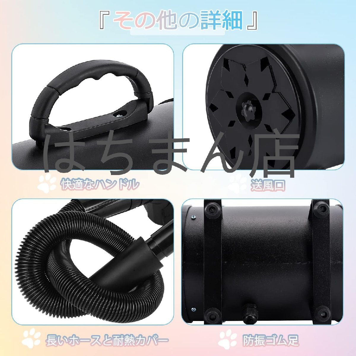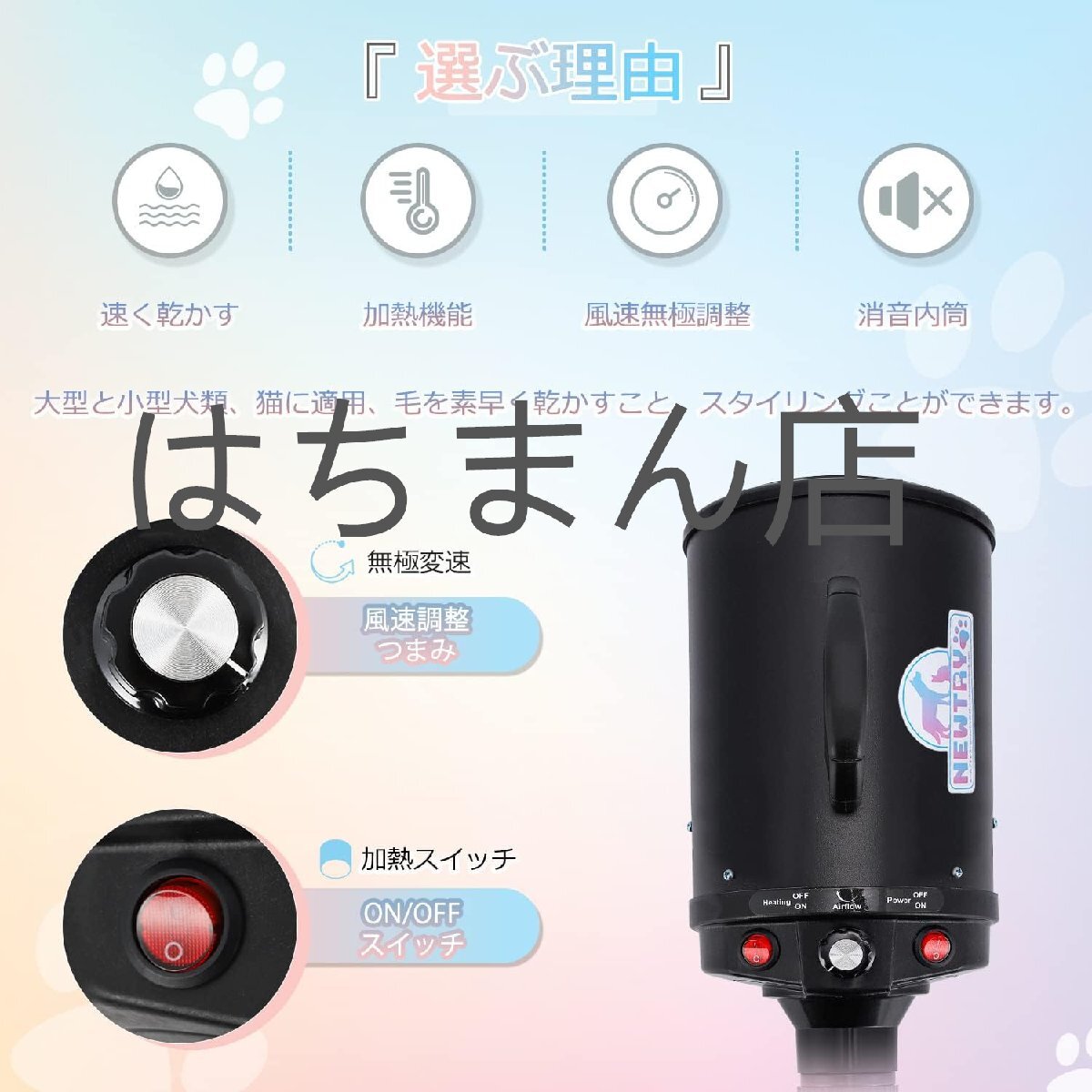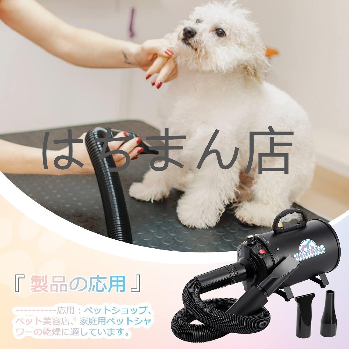 応用:ペットショップ、ペット美容店、家庭用ペットシャワーの乾燥に適しています。大型と小型犬類、猫に適用、毛を素早く乾かすこと、スタイリングことができます。店舗をご確認ください:はちまん店、他の同デザインは全て海賊版でございます、品質は保証されていません、慎重に購入してください。