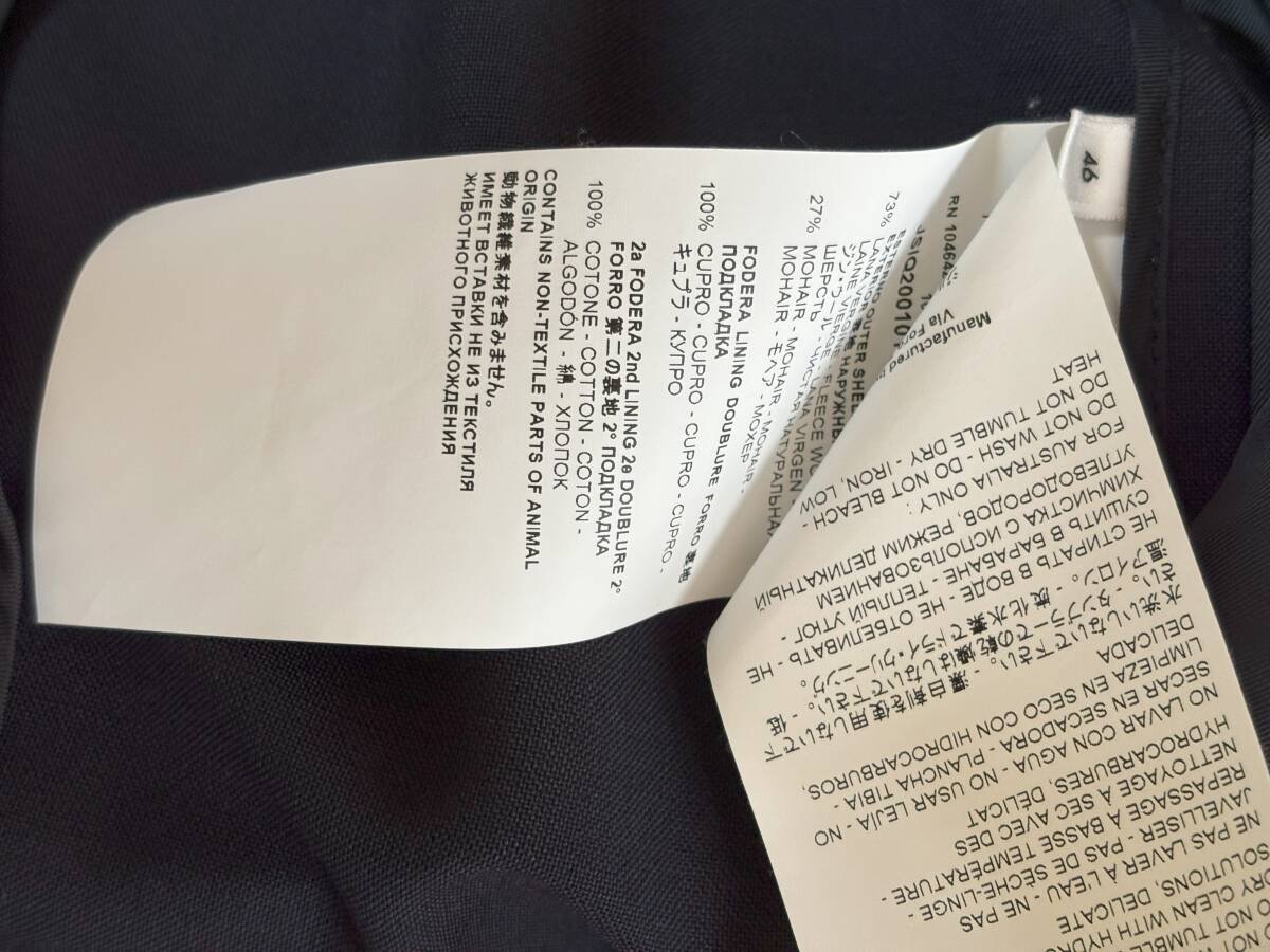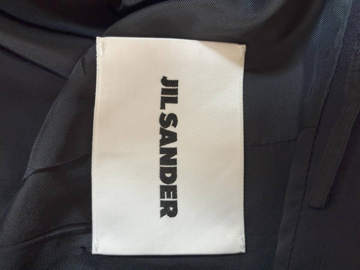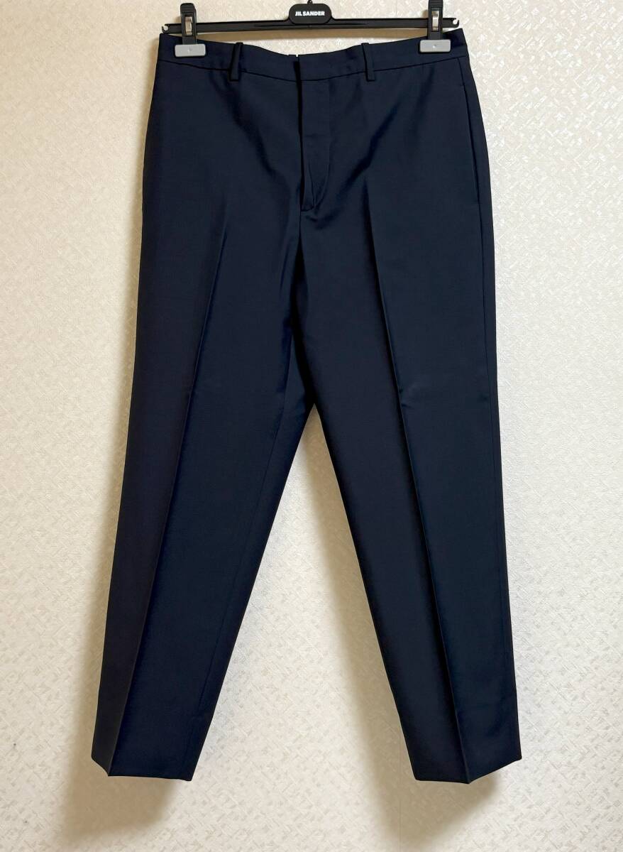 ジルサンダー(JIL SANDER)の春夏ウール・モヘア混スーツ、ネイビー サイズ46です。裏地なしの春夏もの、ウール・モヘア混でやや光沢があります。定番スーツで、ビジネスはもちろん、ジャケットとパンツ別々にカジュアル場面でもコーディネイトできます。素材はウール73%,モヘア27%。元supremeヘッドデザイナー、現OAMCのデザイナールークメイヤーによるデザインです。ルークのジルサンダーらしく他のトップブランドに比べても、もう一段上質な生地を使っています。日本での定価は23万円くらいだと思います。
