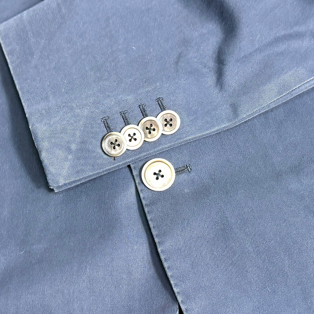デザイン:フロント段返り3つボタン、背抜き裏地、サイドベンツ、袖本切羽。