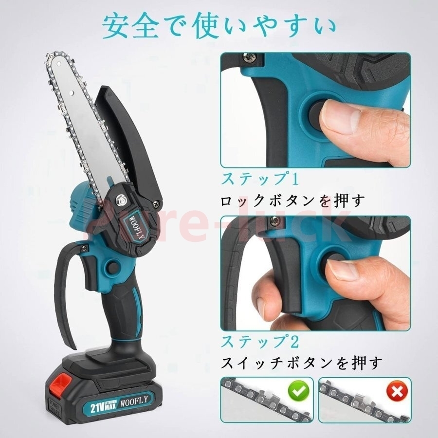 小型チェーンソーは小型で持ち運びが簡単で、電源コードや電源がない場所でも使用できます。女性でも簡単に操作・使用でき、長時