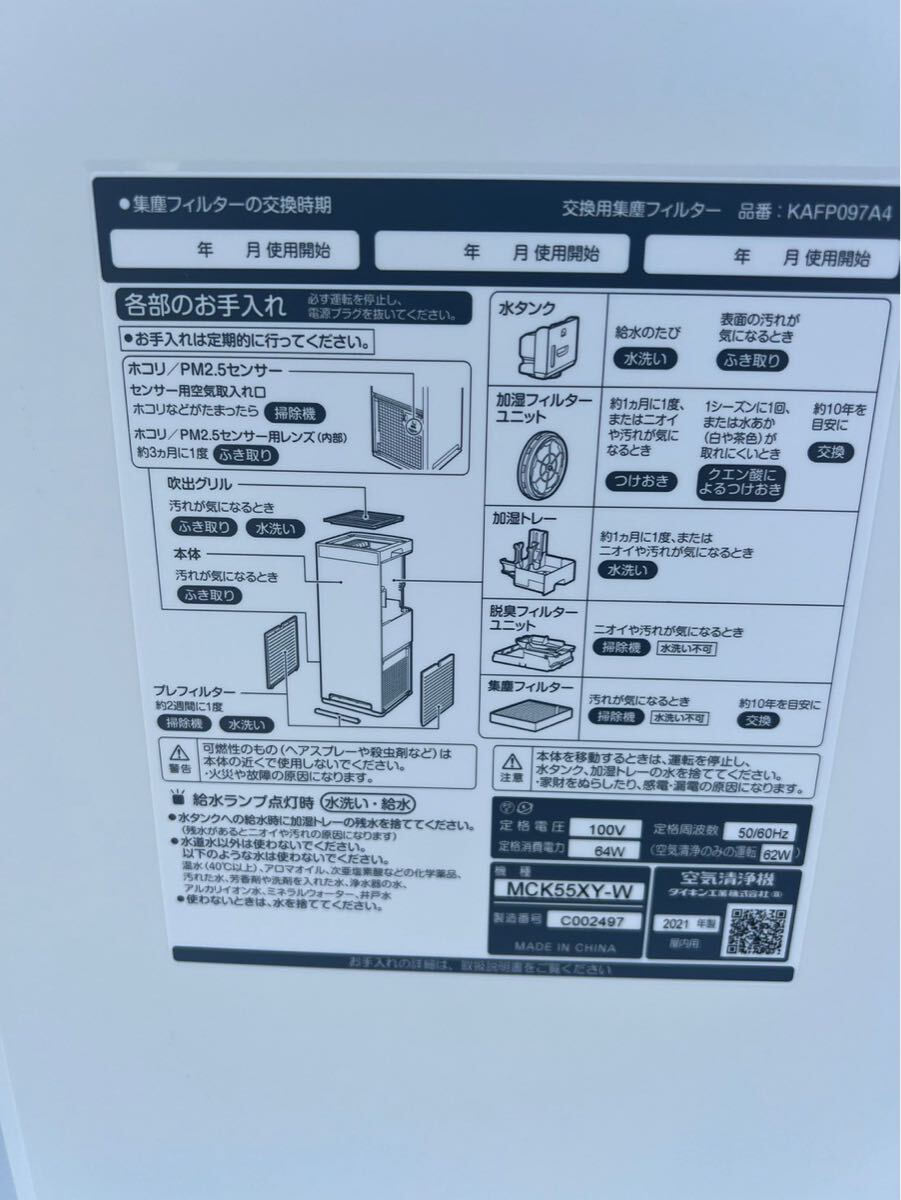 【動作確認済】2021年製 DAIKIN ダイキン 加湿空気清浄機 MCK55XY-W ストリーマ 加湿機能付き ~25畳 リモコン付 A0004