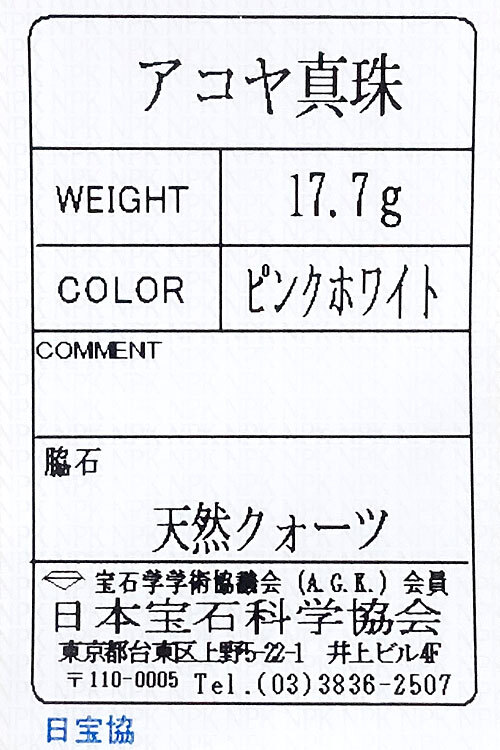■アコヤ真珠 | 色 : ピンクを帯びたクリームホワイトの色合い エクボ・傷 : 珠によりエクボや真珠層ムラはあるが全体的に綺麗な状態 形・テリ : ほぼ真円に近く、テリの綺麗な珠 |