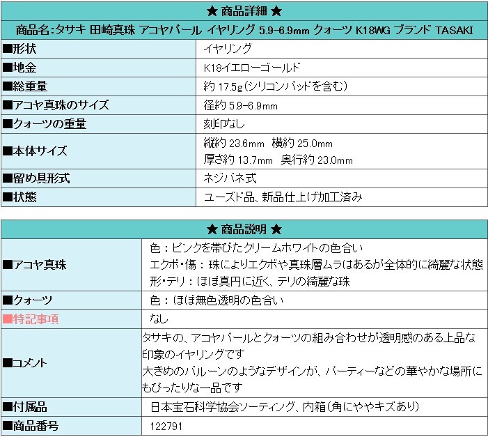 商品名:タサキ 田崎真珠 アコヤパール イヤリング 5.9-6.9mm クォーツ K18WG ブランド TASAKI | |