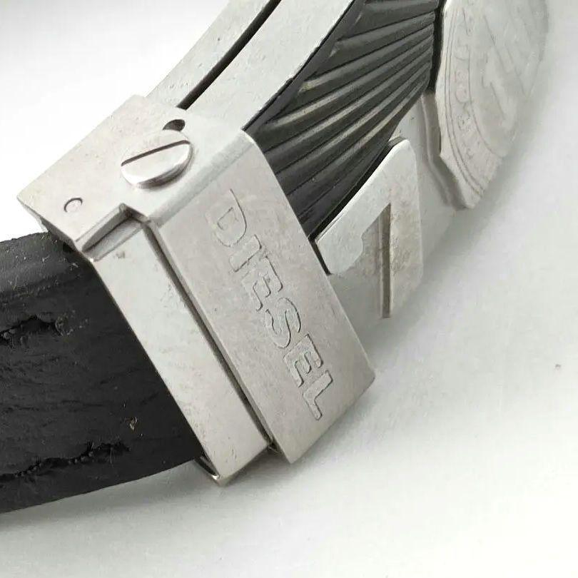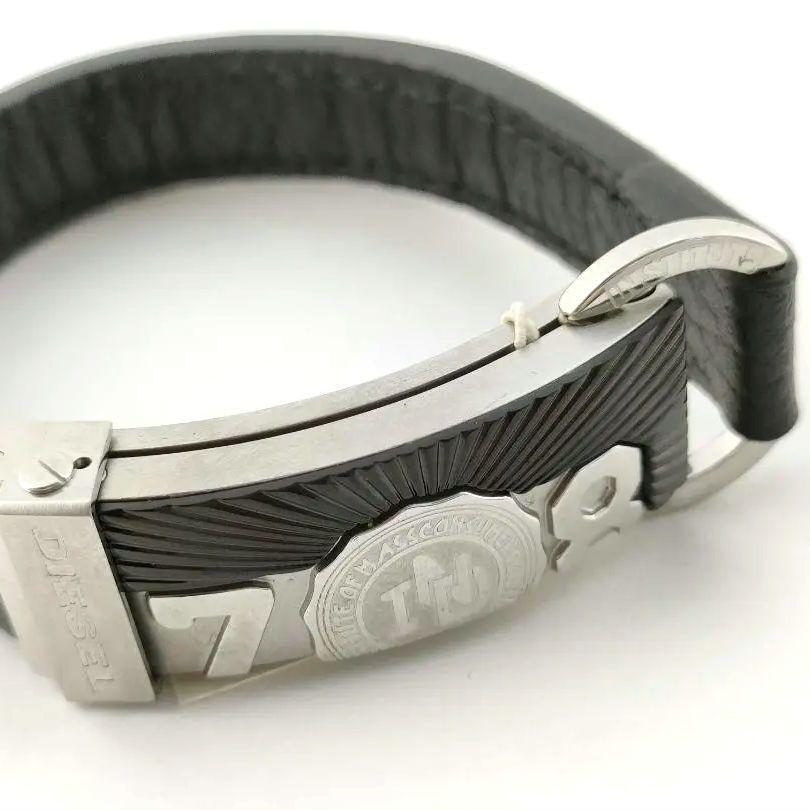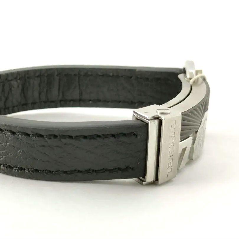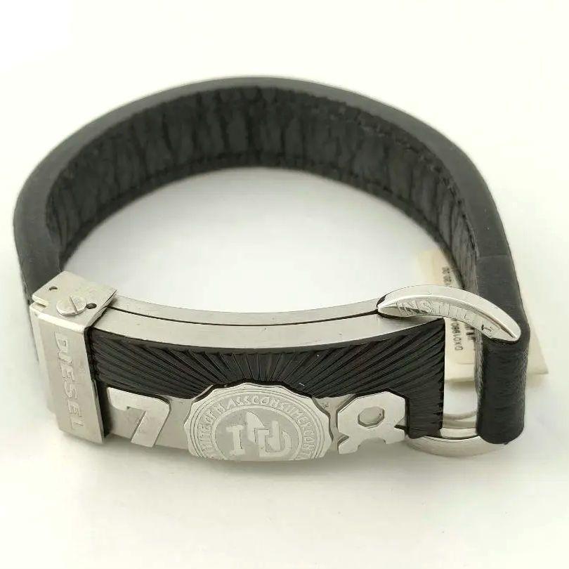 Sturdy design with black leather and silver-tone metal. Features DIESEL's signature engravings like "1978" and a hinged clasp for secure fit.