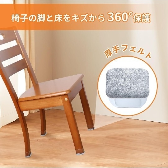 【床保護&騒音防止】椅子あしカバーの底部には厚いフェルトが使用され、いす脚の端をしっかりと包み込む。底部のフェルトは、いす脚の摩耗を効果的に減らし、いすを移動させる際の床との摩擦音を低減し、自分や家族、周囲の人々に静かな環境を提供します。また、床が摩擦されることで傷つくのを防ぐのにも役立ちます。