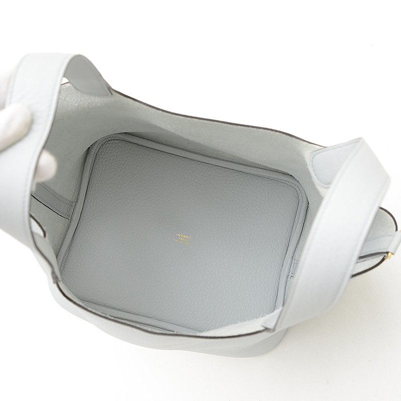 商品特徴 | 淡く上品なブルーペール色が魅力のハンドバッグです。しなやかで人気の高いトリヨンクレマンス素材を使用しており、シンプルなバケツ型フォルムと、開口部を南京錠でロックするユニークなデザインが特徴です。MMサイズは日常使いに最適な収納力で、明るいゴールド金具がエレガントなアクセントとなり、持つだけで装いに優雅さを添える逸品です。 |
