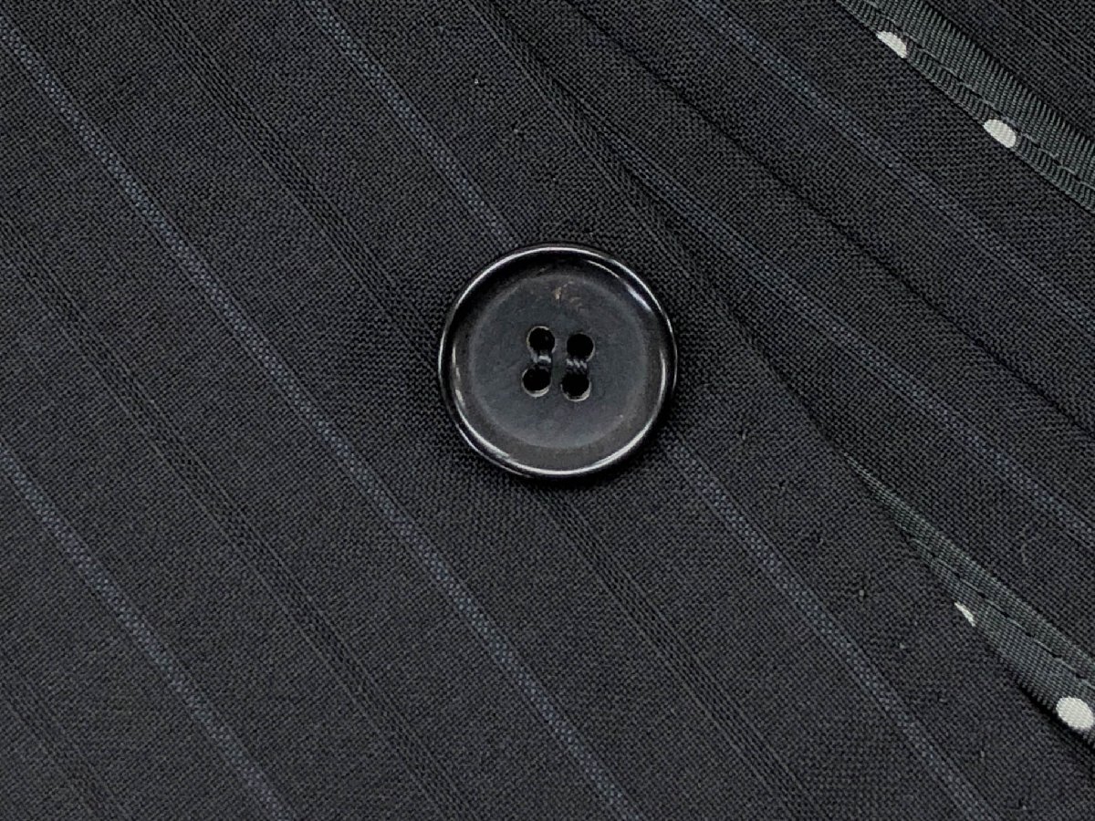 ・多少の着用感、多少のスレ、テカリ、ジャケット裏地所々に薄いシミ汚れ、ジャケット右袖ボタンが2つ欠損しています。がその他の状態は良いです。