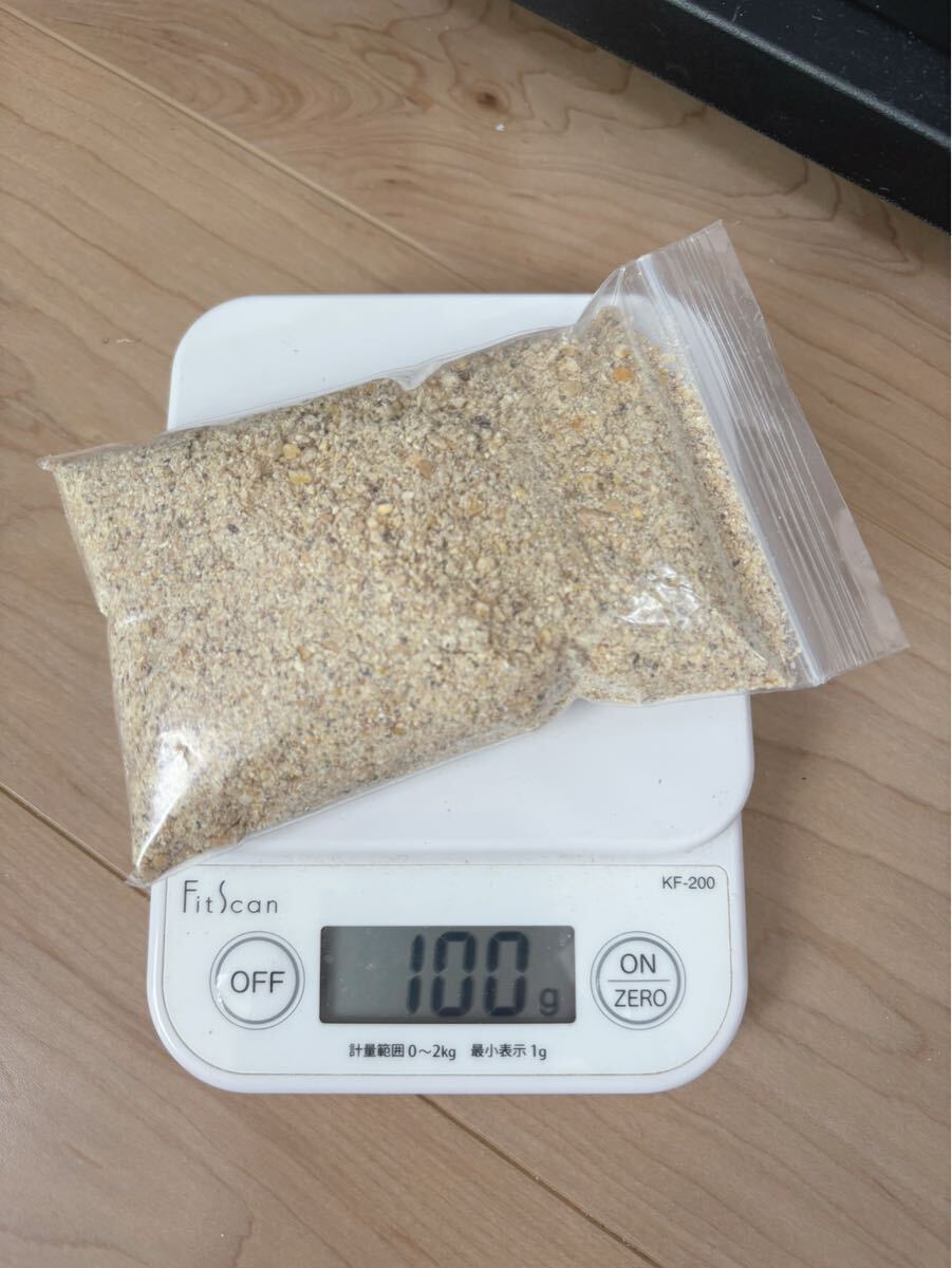 飼料はブレンダーで細かく粉砕(マッシュ状)し、ヒメウズラがどこを食べても栄養の偏りがないように配慮しました。