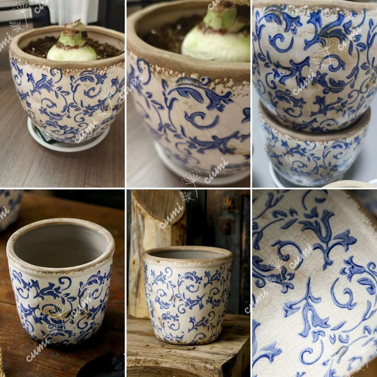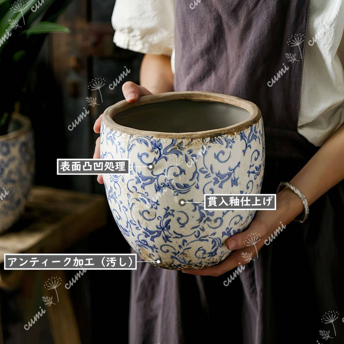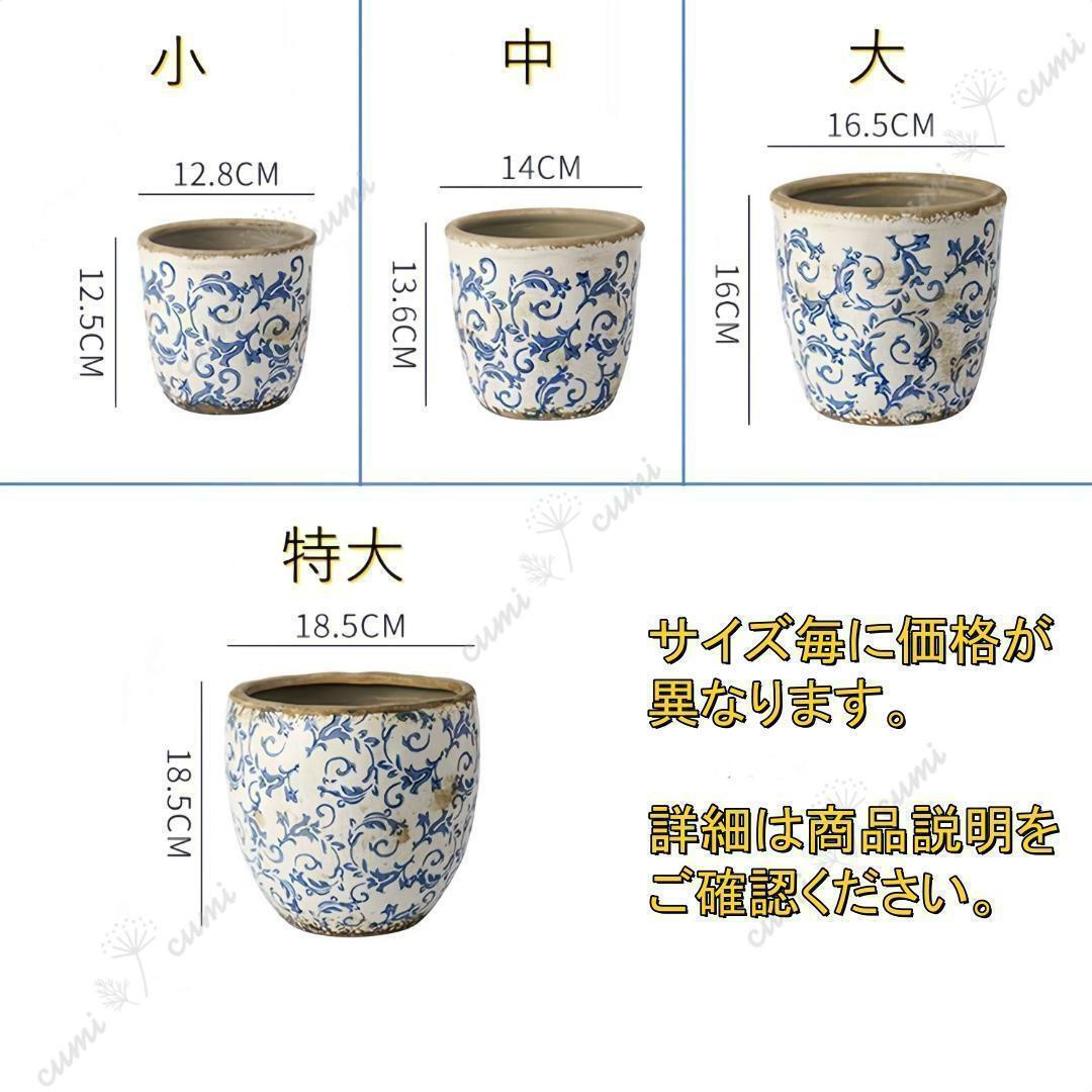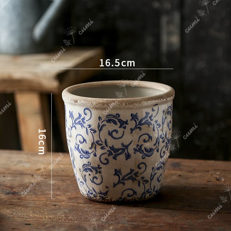 N0220【アジア】大 アンティーク加工 青花 唐草柄 貫入 植木鉢 室内 陶器鉢 多肉 植物 鉢植え インテリア プレゼント 海外