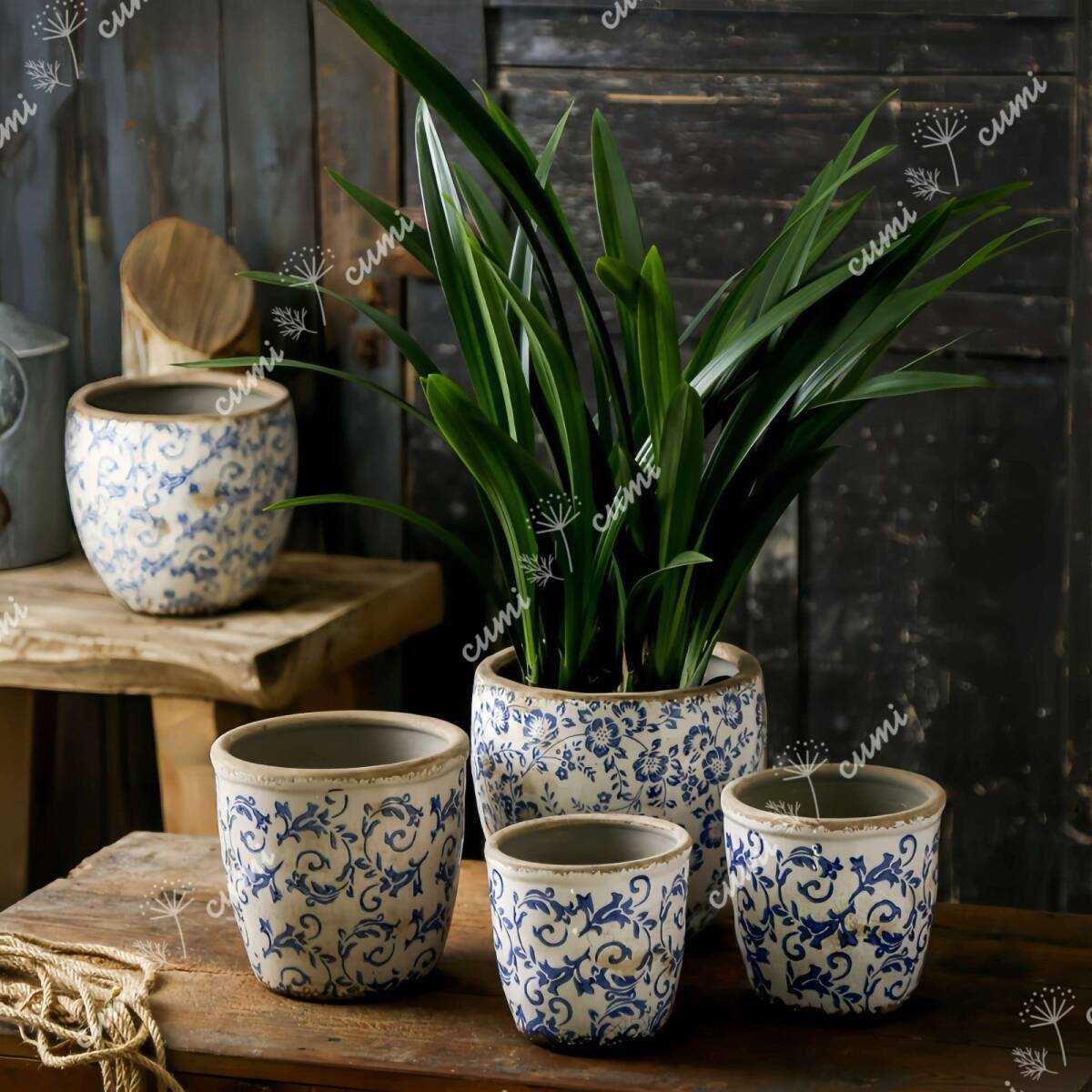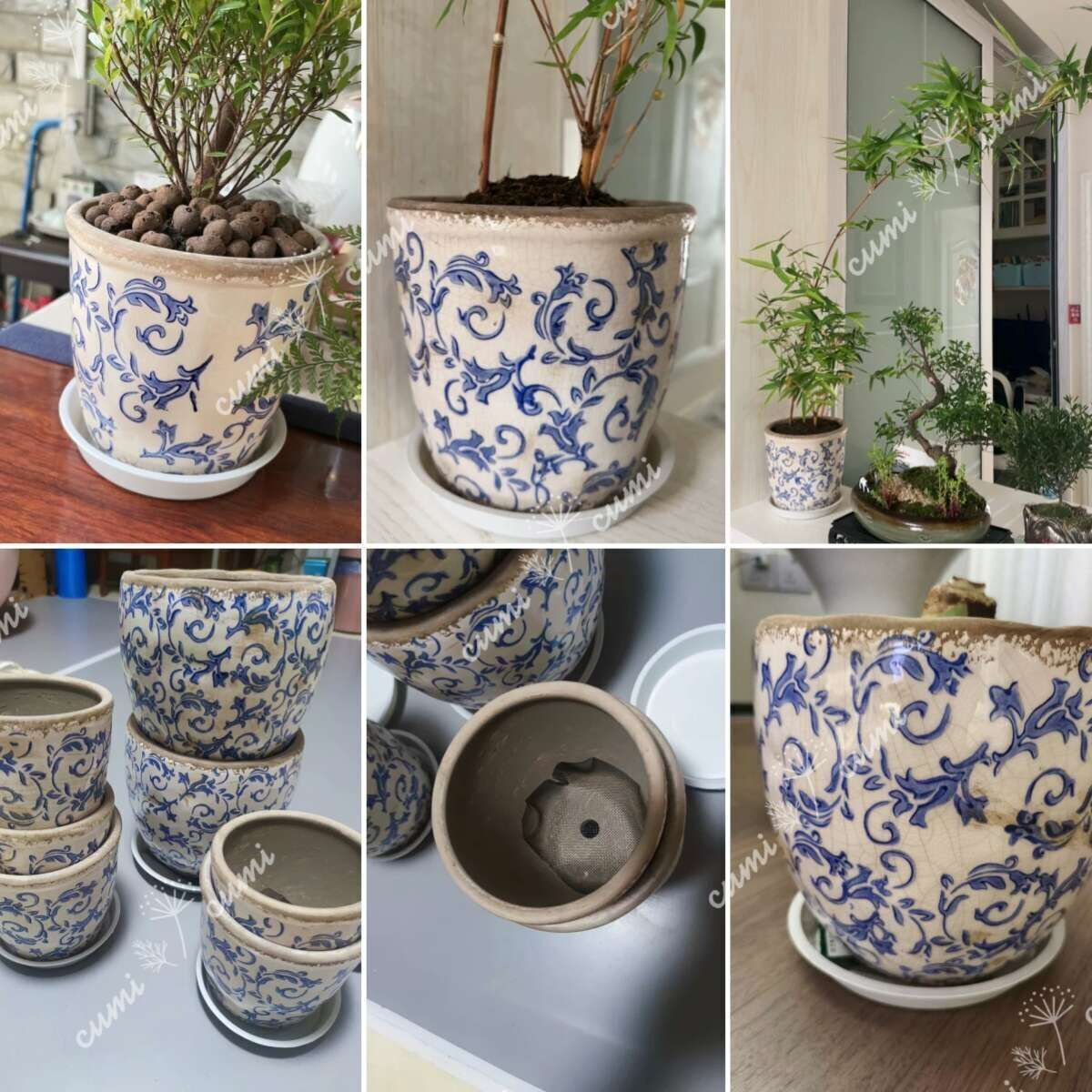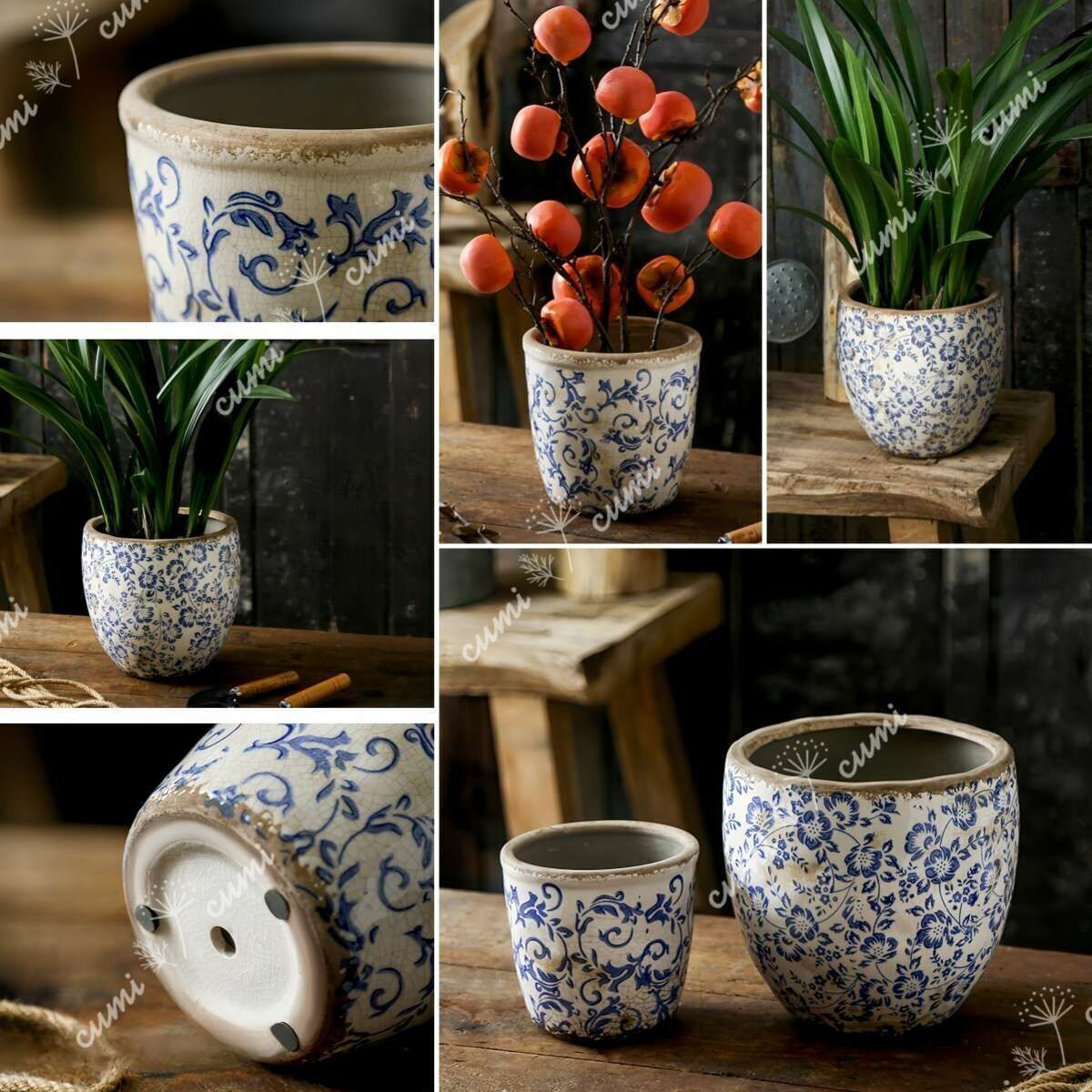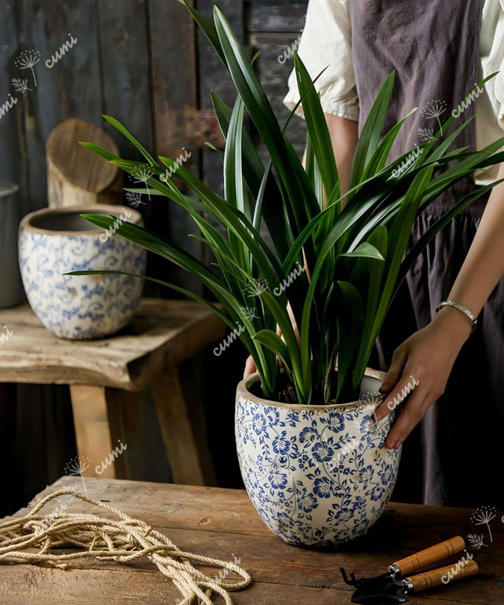 N0220【アジア】大 アンティーク加工 青花 唐草柄 貫入 植木鉢 室内 陶器鉢 多肉 植物 鉢植え インテリア プレゼント 海外