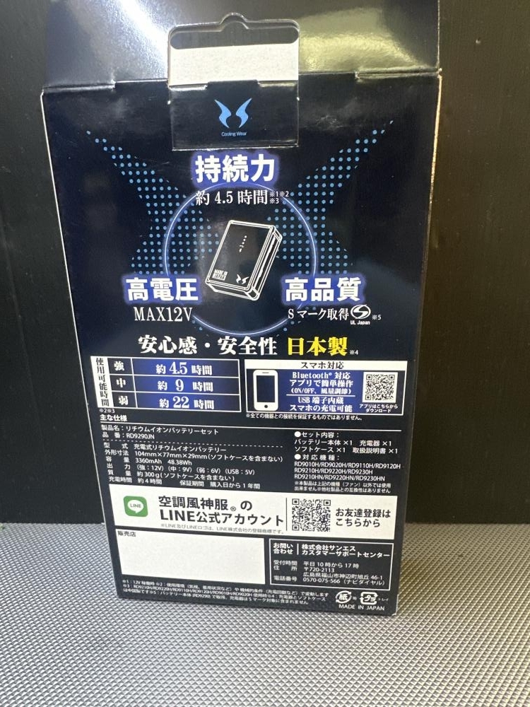 サンエス ■商品名 空調風神服バッテリ&ファンセット ■型番 RD9290JN RD9220H |