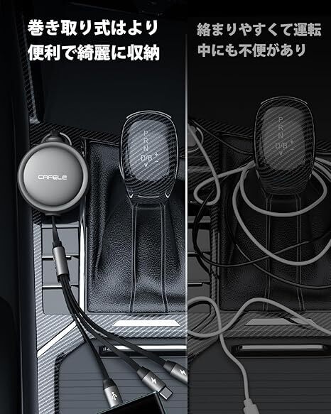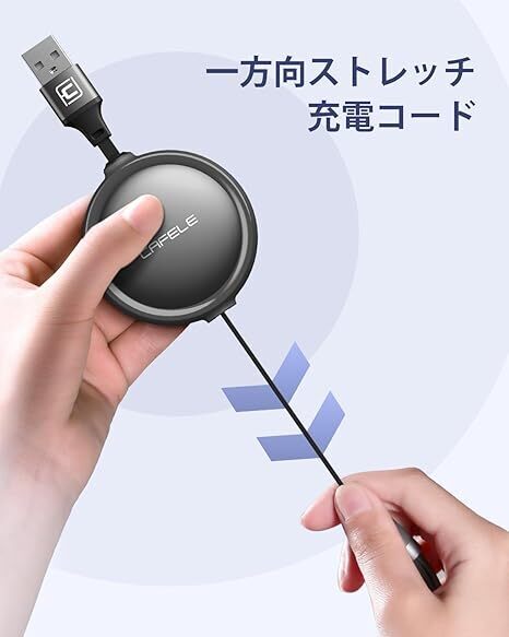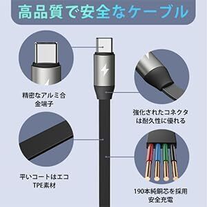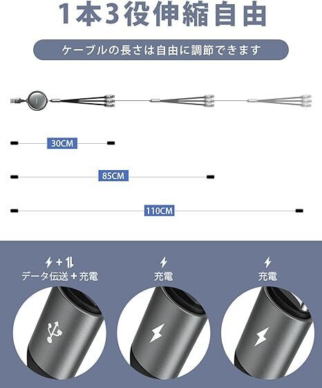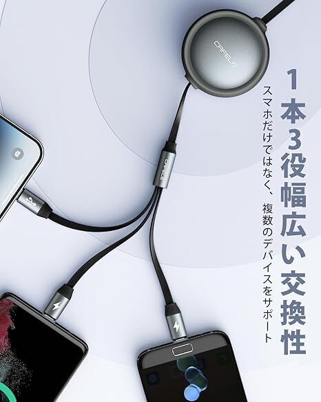 【一方向巻き取り式&片手操作】一方向巻き取り式の設計を採用して、リール部分は動かず固定されます。リール内に1本だけのケーブルが収納され、片手で操作可能、引っかかるや絡む等の心配はありません、スムーズに使えます。また充電器やモバイルバッテリーに挿したままでも快適にケーブルを伸びます。日常の充電時より便利になります。子供や老人でも簡単に使用可能です。巻き取り式ケーブルは30cmから105cmまで3段階の長さを自由に調節でき、伸縮自由に簡単に収納でき、普段外出、旅行、オフィス、車内、出張などに携帯用は大変便利です! 【一本3役&持ち運び便利】1つのUSBポートから3台のデバイスが同時に急速充電できますし、3種類のコネクターを搭載し、市場ほとんどな機種に対応できます。スマホの種類がバラバラの家族にも問題なく通常として使用できます。また、モバイルバッテリー、車載USB、PCのUSBにて問題なし、地震などの震災に非常用に役に立ちます。 【3A急速充電&データ転送】3in1 充電ケーブル巻き取り式は銅製心線を採用し、電気抵抗が低く、 充電速度がより速くなり、充電時間も短縮してくれます。 また、コネクタは耐熱アルミニウム合金端子を採用しており、良い導電率を持ていて、データ損失も最小限に抑えます。高品質の充電とデータ転送多機能ケーブルです。(注意:type-cはデータ伝送できません) 【高い耐久性】この3in1 充電ケーブルは耐久性が抜群なア銅製心線を使用し、高級感だけでなく品質向上になっています。usb type c ケーブルは高品質なTPEを採用するので、柔軟性が良くて耐久性も抜群です。取り回しやすく、絡まりを防ぎ、柔らかくて断線しにくいです。数万回以上折り曲げても、性能上のダメージや変化はありませんでした。