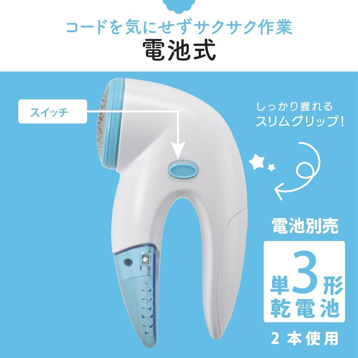 【在庫品のみ】 電機 電動 毛玉取り器 スリムグリップ 電池式 毛玉取り機 ブルー 毛玉クリーナー けだまとり オーム(OHM)