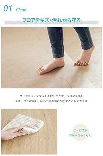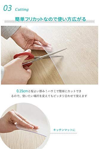 【透明マット・そのままの美しさ】キッチンマットのデザインやカラー、素材は豊富にありますが、キッチン・お部屋のインテリアや雰囲気に合うものを選ぶとなると、どれを選んでいいのか悩んでしまう人も多いかも知れない。透明のキッチンマットであれば、フローリングなどのイメージを損なうことなく、インテリア雰囲気もそもままに、しっかり役割をはたしてくれます。厚さは僅か1.5mm、つまずく心配もなくお使いいただけます。