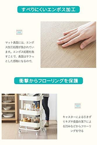 【エンボス加工・床暖房対応】マットの表面にはエンボス加工が施してあり、表面はさらっと心地よい感触をもたせ、裏面はツルツルとした面で床と馴染みやすく、ズレにくい仕様となっております。PVC素材特徴の一つは、耐熱性があるので、耐熱温度は85℃まで、床暖房の上に対応可能!飲み物をこぼしてもフローリングや畳に染み込まず清潔をキープ。