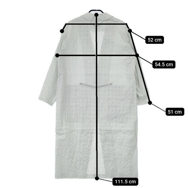 実寸サイズ | 肩幅:約52cm 着丈:約111.5cm 身幅:約54.5cm 袖丈:約51cm ※採寸画像がある商品はハンガーに吊るした状態での計測のため、平置きでの採寸とは差が生じる場合がございます。平置きでの実寸サイズをご希望の場合は、ご購入前に必ずご質問ください。 ※記載以外のサイズが合わないことを理由とした返品はできませんので、 記載部分以外で実寸サイズの気になる箇所があれば必ず購入前にご質問ください。 |