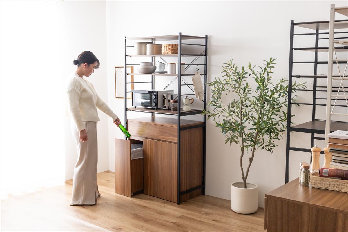 隠しキャスター付きのゴミ箱に加え、炊飯器やポットの収納に便利なスライドトレーや、使い勝手の良い可動式収納棚も備え、機能性も抜群です。