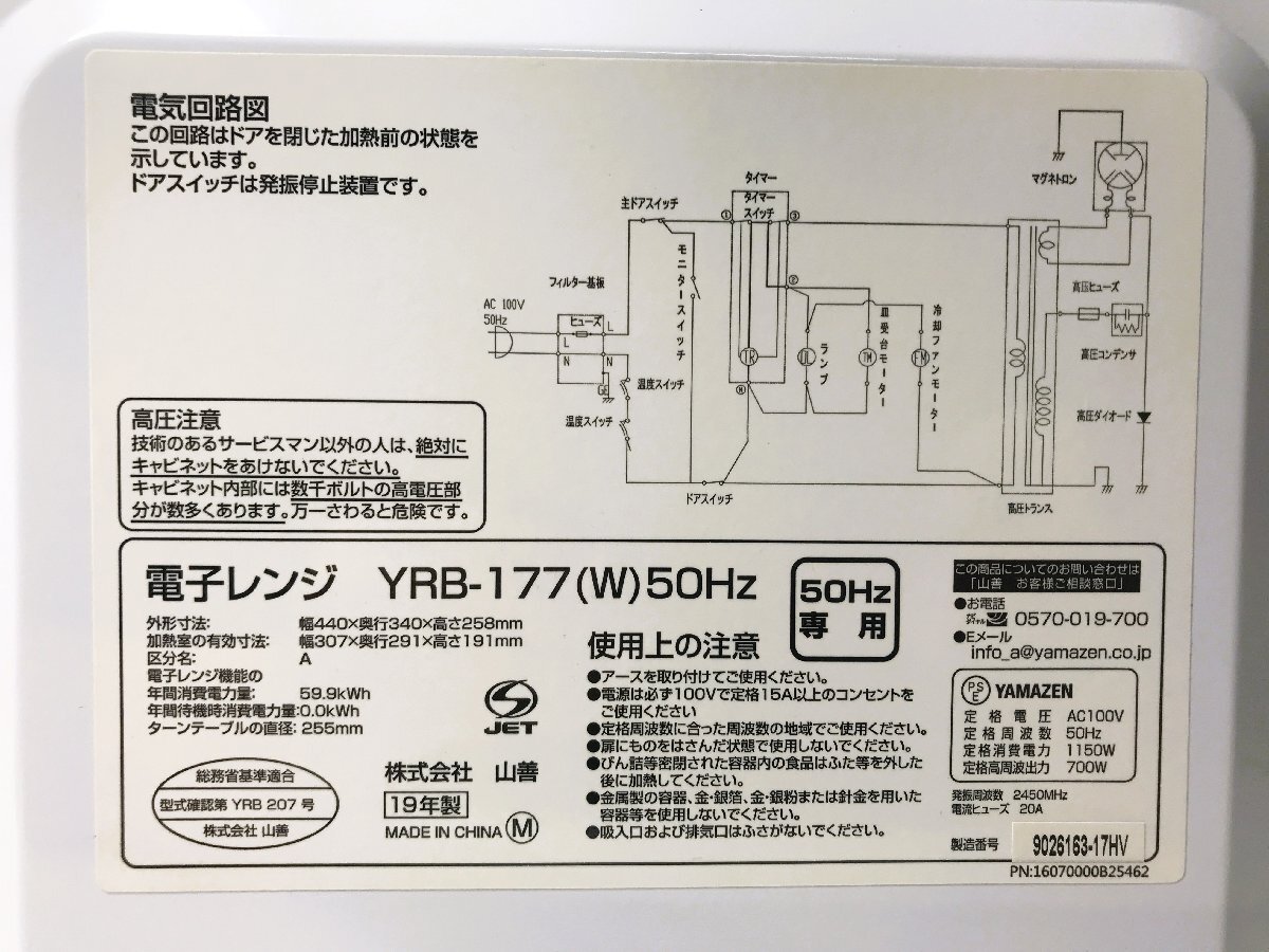 【中古】YAMAZEN 山善 電子レンジ ターンテーブル 東日本50Hz YRB-177W 2019年 ホワイト 動作確認済 家電