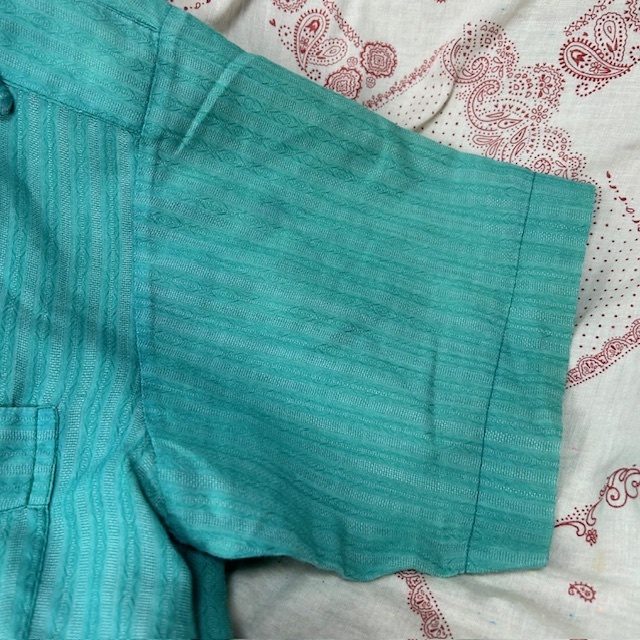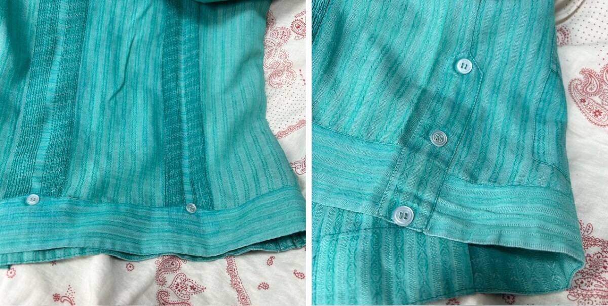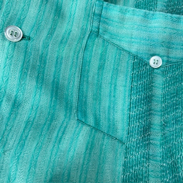 ●商品説明・・・アメリカ古着になります。80年代~90年代頃と思われるのオールド・ヴィンテージのオープンカラー(開襟)キューバシャツです。珍しいストライプのような柄織りの生地で、シンプルなサイドライン・4つポケットの着回しやすい一着です。メキシコ製で、素材はポリエステル80%でコットン20%、薄めのさらっとした夏らしい生地質です。色は薄緑のような感じです。サイズ表記は40で、M~やや小さめL程度のサイズ感かと思います。自宅クローゼットに25年程度保管していた物になり、出品前に洗濯後した時に、経年による物かボタンに欠けやヒビが見られましたので、出品前に飾りボタン含めすべてのボタン交換してあります。