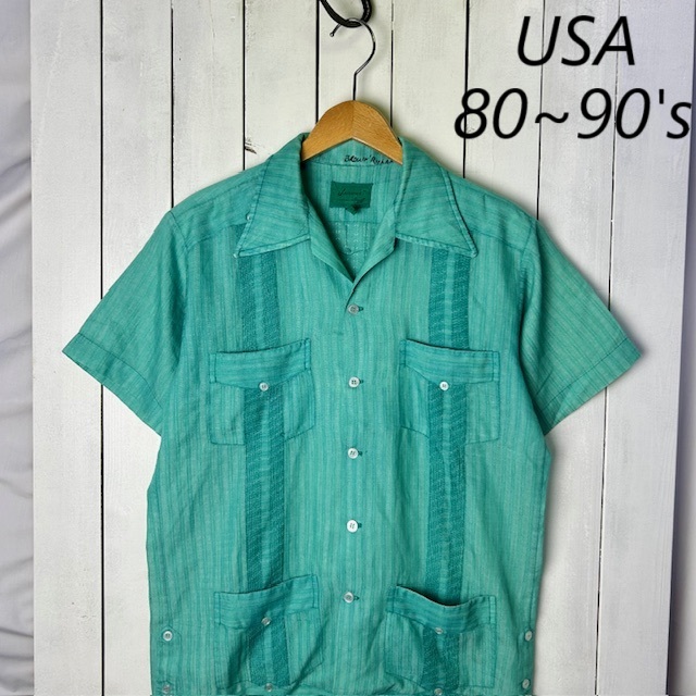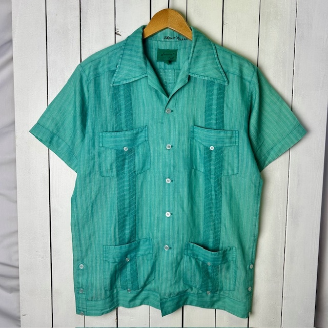 sh●992 USA古着 80s90s JAROCHA 柄織り 開襟キューバシャツ 40 薄緑 M~L オールド ヴィンテージ アメリカ古着 メキシコ製 グアテマラシャツ