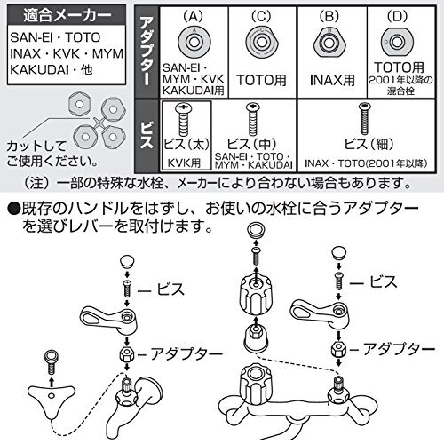 ・ブルー|ホワイト PR2332F・【節水】取り付けの際に、レバー位置を調整できるので好きな水量の位置に調整できます。・※詳しい取り換え方法は、商品画像内のビデオをご覧ください。・【簡単に止水・吐水】通常の三角ハンドルに比べ、操作がしやすく、肘や手の甲を使って簡単に開け閉めできます。感染症対策にも最適です。・【湯・水も分かりやすい】ピンクと水色のキャップが付属しているので、お湯か水かが一目でわかります。・【他メーカーでも安心】アダプターが4つ付属しているため、ほとんどのメーカーに対応します。《適合メーカー》SANEI・TOTO・LIXIL(INAX)・KVK・MYM・KAKUDAI・他 ※一部の特殊な水栓、メーカーにより合わない場合もあります。説明 商品紹介 素材:ABS樹脂、ポリアセタール 長さ(mm):66 より ●小さな力でしっかり開閉できるワンタッチレバー ●水もれや水の出しすぎを防ぎ、節水効果 ●湯・水キャップ付き ●アダプター付で、ほとんどのメーカーに取付可能 ●取替え簡単