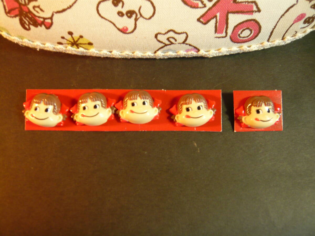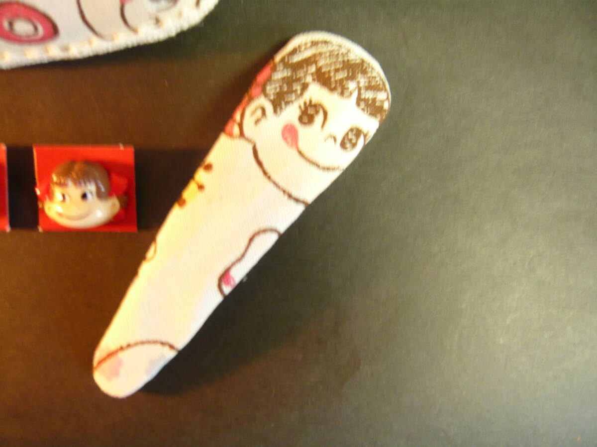 それぞれのサイズ ペコちゃんメガネケースは、長さ約16センチ、最大幅約7.5センチ、高さ約4センチ ペコちゃんバレッタ(ヘアピン・ヘアクリップ)は、長さ約10センチ、最大幅約3センチ ペコちゃんボタン 上下約1.5センチ、左右約2.3センチ、厚み約1センチです。