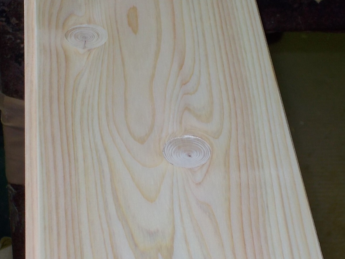 檜の丸太の背板を人工乾燥機にて約60度で1週間程度乾燥し、死に節と枯れ節は「木栓機」にて抜き取り、実際の木の枝から製品化されました、「埋木(うめき)」にて木栓補修しております。