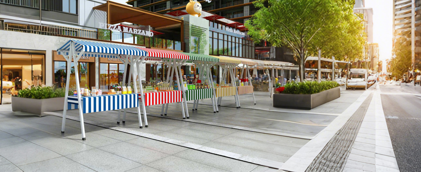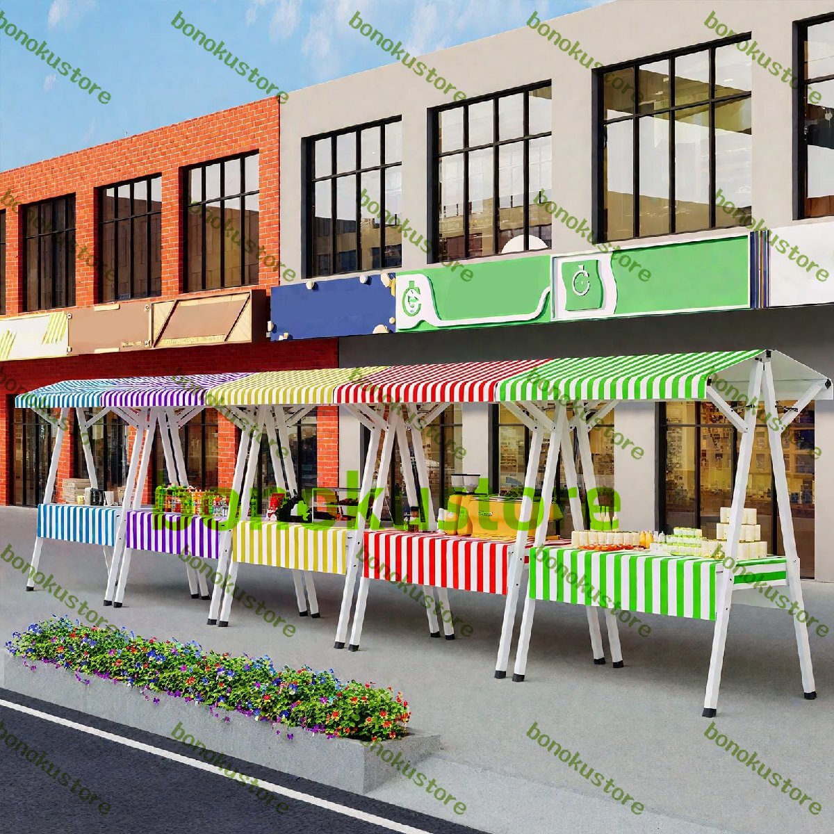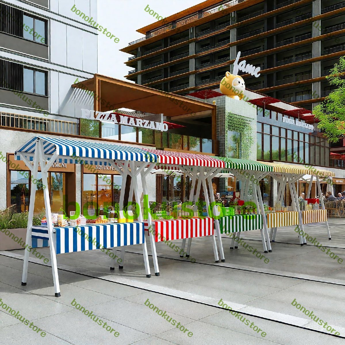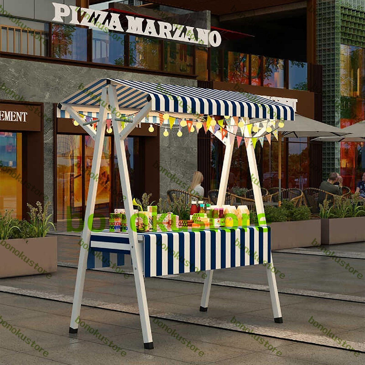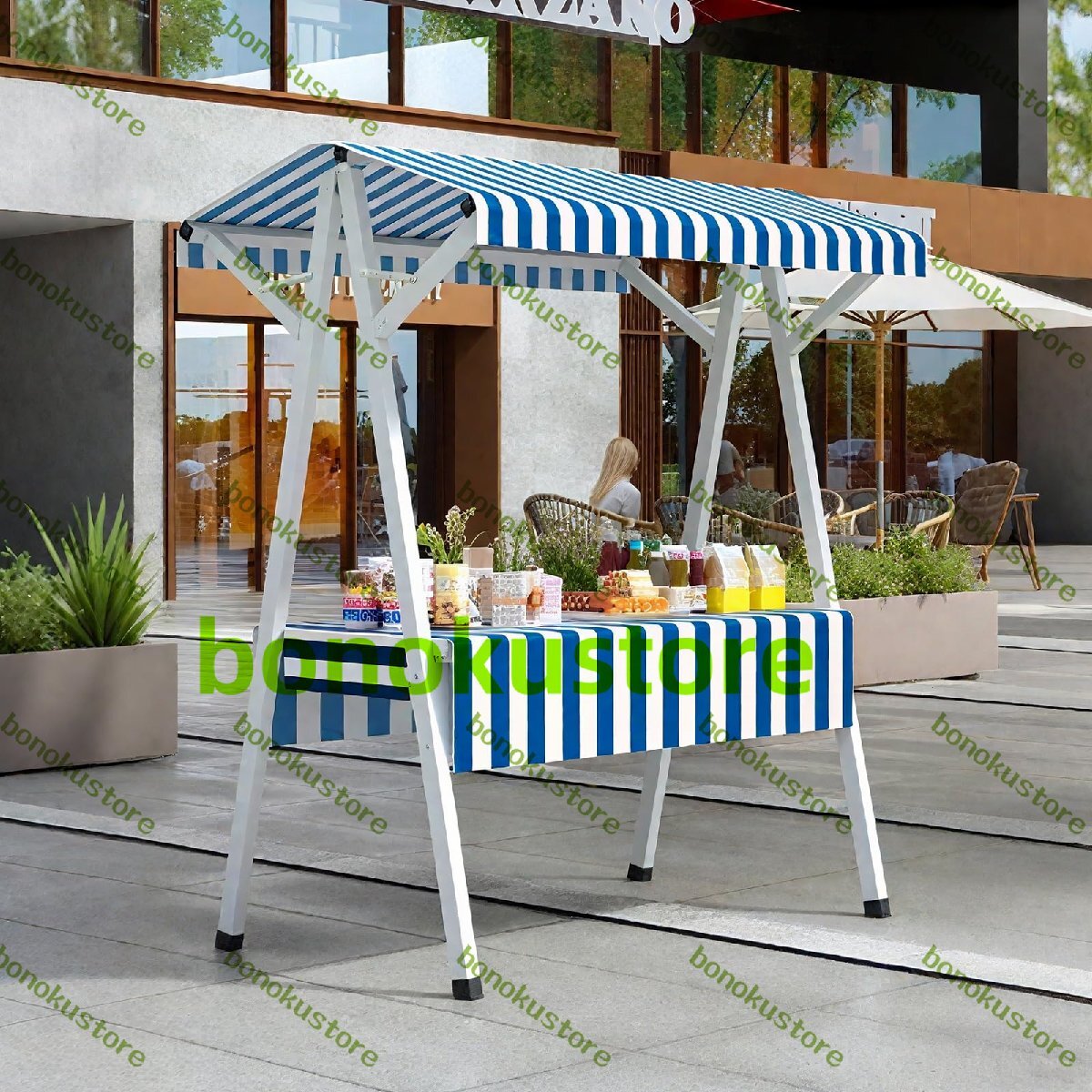 【日除け付き屋台】仮設屋台セット日差しを効果的に遮るオックスフォード布製の天蓋を装備。商品を紫外線や小雨などから守りつつ、目を引くデザインのテーブルクロスで、お客様の視線を集めます。