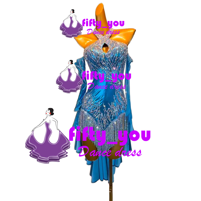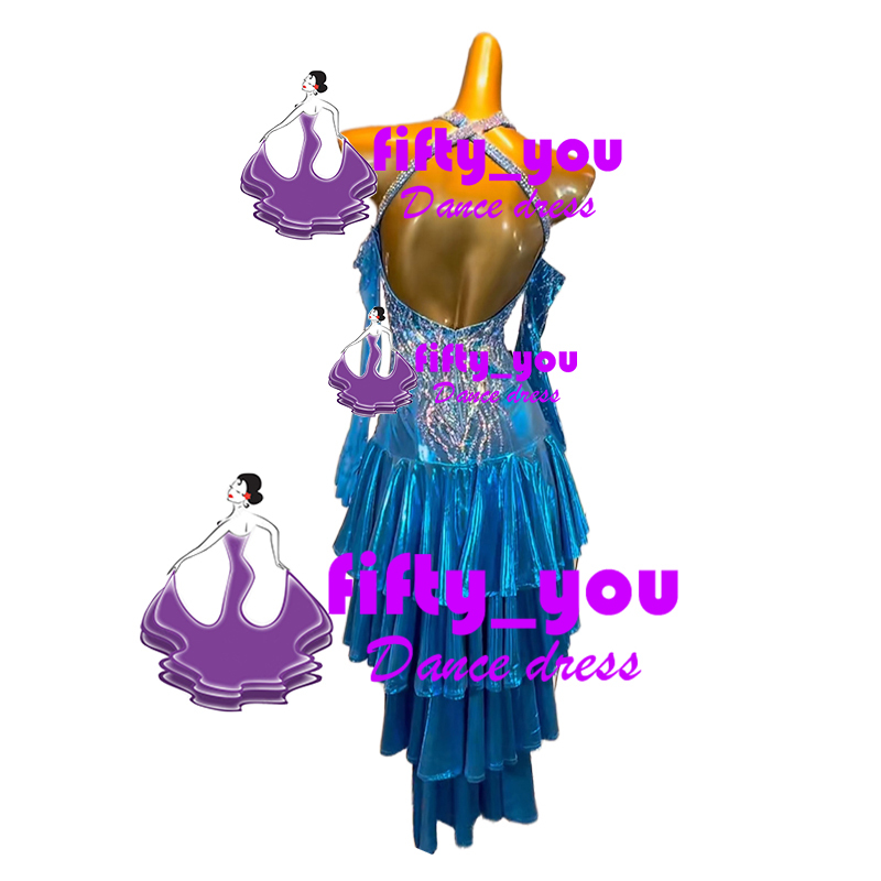 新品fifty_youゴージャス新作 レディース社交ダンス衣装  ラテンドレス セミオーダー 競技試合用高級ドレス キラキラ石飾り 水色