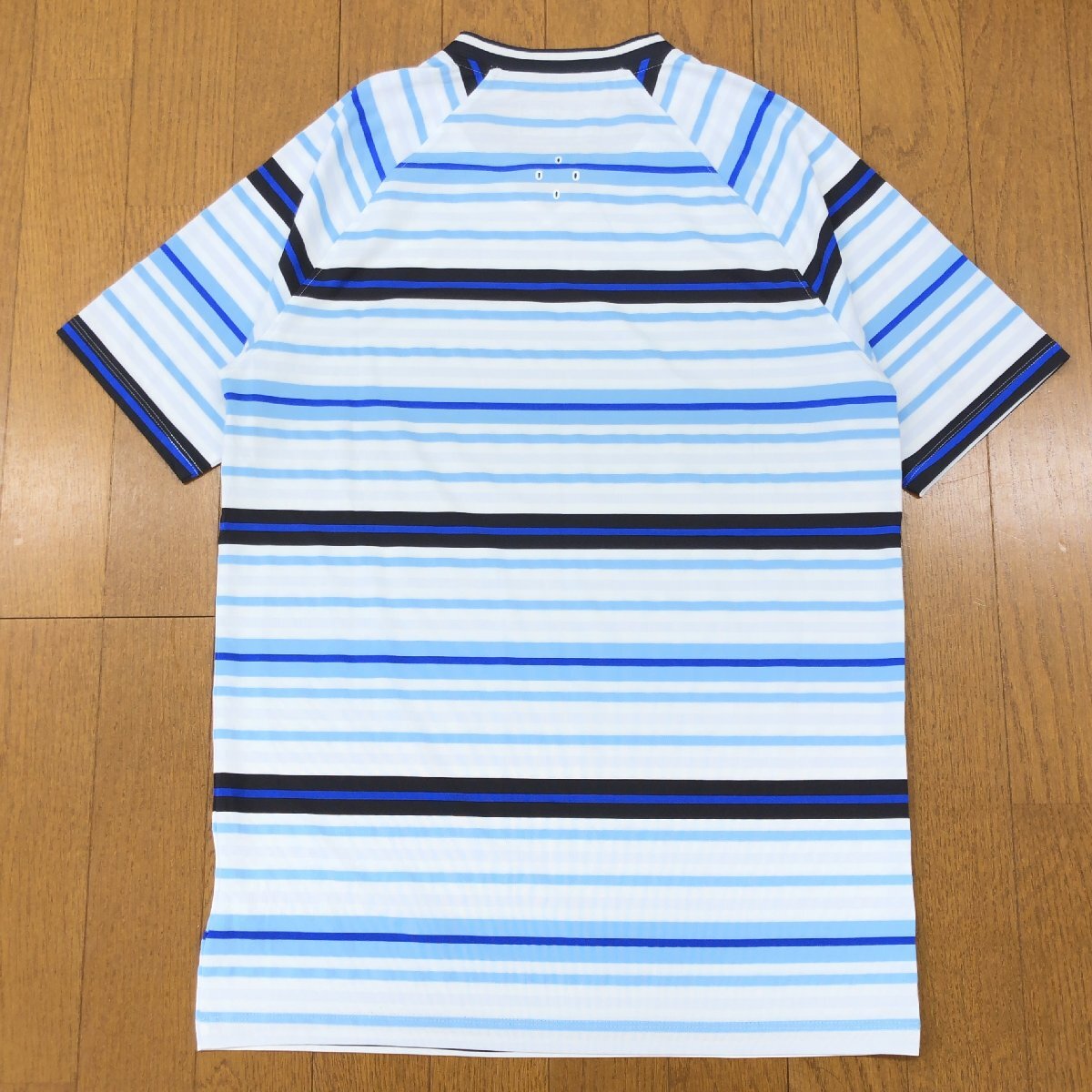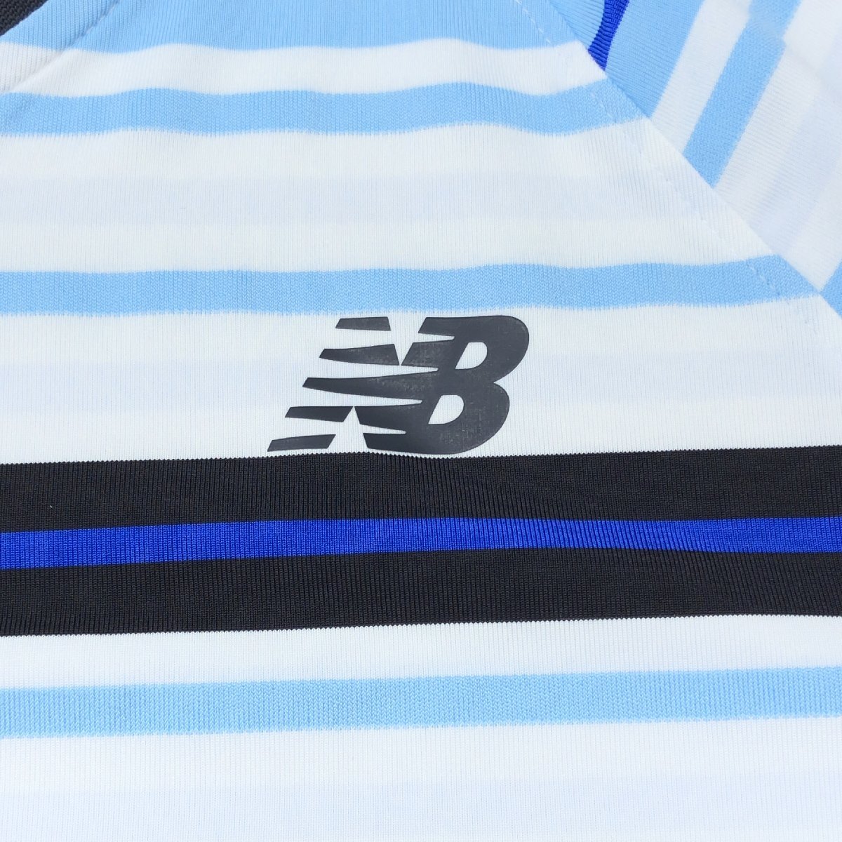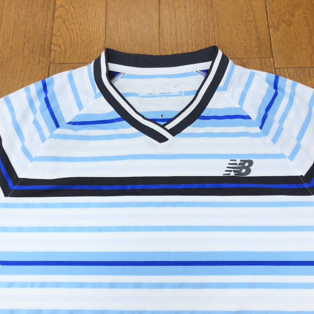 美品 New Balance ニューバランス ストレッチ ドライ Vネック トレーニングシャツ S 白×ライトブルー 半袖 ボーダー Tシャツ ジャージ