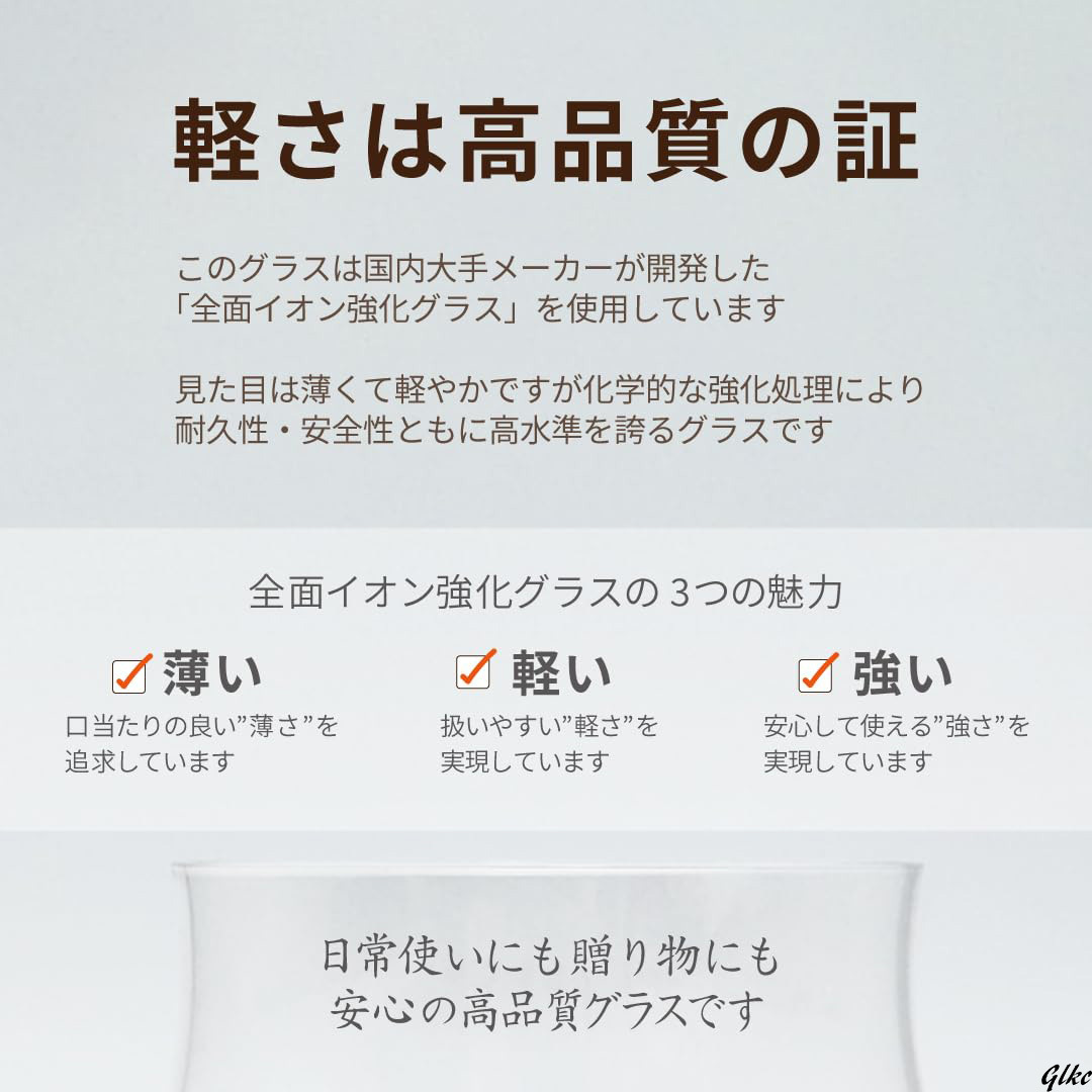 軽くて口当たりの良い薄づくり口部仕上げの強化ガラスは、女性にも扱いやすい小ぶりサイズで、日常にも特別なシーンにもそっと寄り添います。