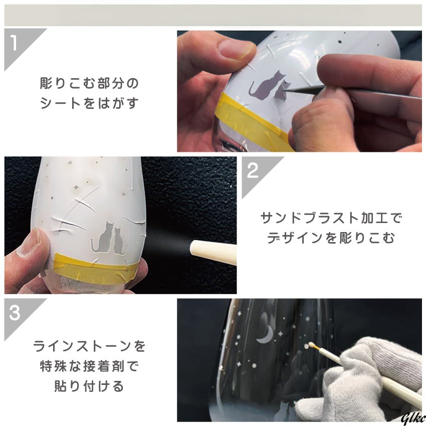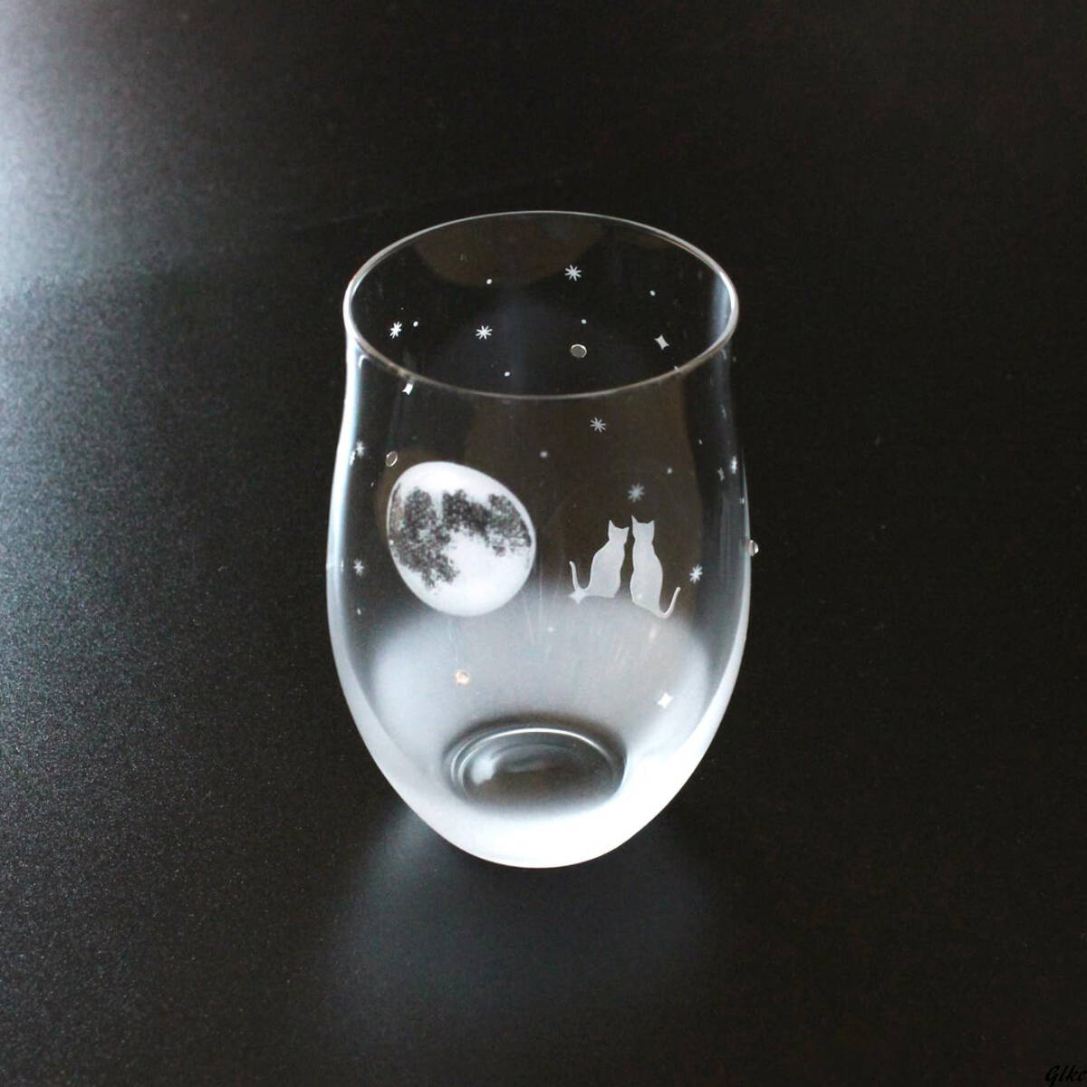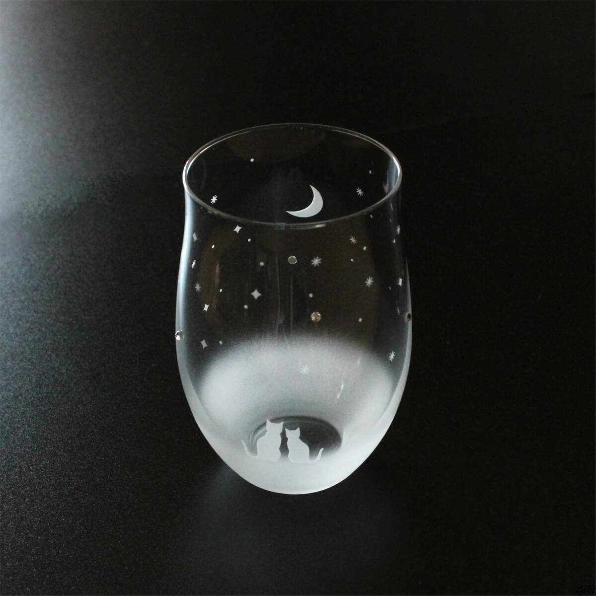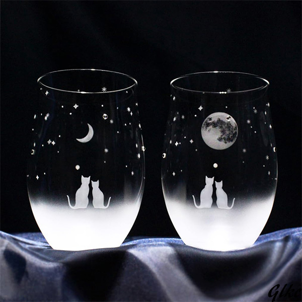 グラスにはサンドブラスト技法で繊細に彫刻された猫たちと月が描かれ、どの角度から見ても異なる情景が楽しめます。
