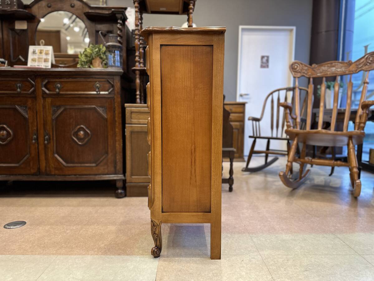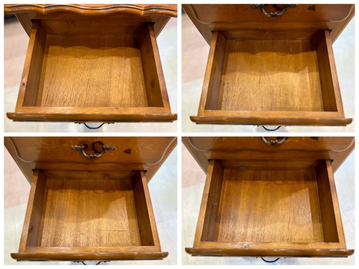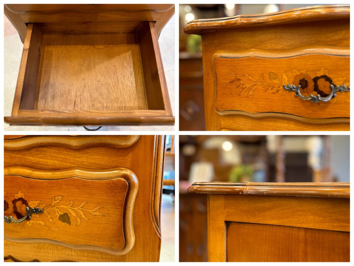 象嵌(ぞうがん)は、「インレイ」と呼ばれ 一つの素材に異なった素材を嵌め込む技法のことを言います。 もともと象は「かたどる」嵌は「はめる」という意味があります。 象嵌には金属象嵌や大理石象嵌などありますが 中でも木製象嵌はとても繊細で美しく、まるで芸術品のようです。 木を薄くカットして細工を行うため 収縮のしないウォールナット材やマホガニー材などの上質な素材の家具にのみ この技法が使われています。 そのため、象嵌が装飾された家具は貴重で高価なものが多くみられます。 【商品状態】 天板等に引っ掻き傷があります。 使用感がありますので写真にてご確認下さい。 引き出しはスムーズに開け閉め出来ます。 気になるような匂いもありません。 【商品詳細】 サイズ: W 495 D 345 H 975 【発送】 ヤマト運輸らくらく家財便での発送となります。 サイズランク: Bランク -=--=-=-=-=-=-=-=-=-=-=-=-=-=-=-=-=-=-=-=-=-=-=-=-=-=-=-=-= 【取引詳細】 ・落札後のキャンセルはお受けできません。 ・支払いはヤフーかんたん決済のみとなります。 ・配達日、時間のご指定がある場合は落札後、お支払い前にご連絡下さい。 地域によっては時間指定ができない場合もございますのでご了承下さい。 配達日時のご指定のない場合は最短での配達となります。 大きなサイズの商品については予め搬入経路のご確認をお願い致します。 吊り上げ等の作業が必要な場合はお客様のご負担となります。 ・返品はお受けできません。 ・中古品の為、欠損やダメージの見落とし等ある場合がございます。 写真に載っていない・説明に書いていないなどの理由での返品も原則応じかねます。ご理解頂いた上でのご入札をお願い致します。 ・商品について気になる事がありましたら、お気軽にご質問下さい。 ・即決、値引きについての質問にはお答えできません。 ・オークションの取消 出品中の商品は店頭販売も行っております。 店頭で販売された商品については取消、取引のキャンセルを 行う場合がございますので予めご了承下さいませ。 ■■■お願い■■■ ・落札後、24時間以内にご連絡お願い致します。 ・直接のお引取ご希望の場合はその旨ご連絡下さい。 ・ヤフオク仕様変更により、こちらからお客様お電話番号が見えなくなっております。 ヤマト依頼時に必須になりますのでお客様のお電話番号をお知らせ下さいませ。 ■■■発送方法■■■ ・送料は元払いで発送致します。 ・送料は落札者様負担となります。 *上記の内容をご理解頂き納得の上 入札をお願い致します。 -=--=-=-=-=-=-=-=-=-=-=-=-=-=-=-=-=-=-=-=-=-=-=-=-=-=-=-=-= アンティーク家具や雑貨を取り扱っている店舗より出品をしております。 ヤフーオークションへの出品は一部商品となっておりますので 機会がございましたら店舗へのご来店をお待ちしております。 静岡県伊東市吉田 142 SNSにて入荷商品や、店内の様子を紹介しております! 下記のアカウントで検索してみてください♪ Instagram:@aston_antiques TikTok:@aston_antiques -=--=-=-=-=-=-=-=-=-=-=-=-=-=-=-=-=-=-=-=-=-=-=-=-=-=-=-=-= ■■■当店ホームページ■■■ https://aston-recycle.jp/ ホームページに店舗のご案内が掲載されていますのでご覧下さい。 | |||