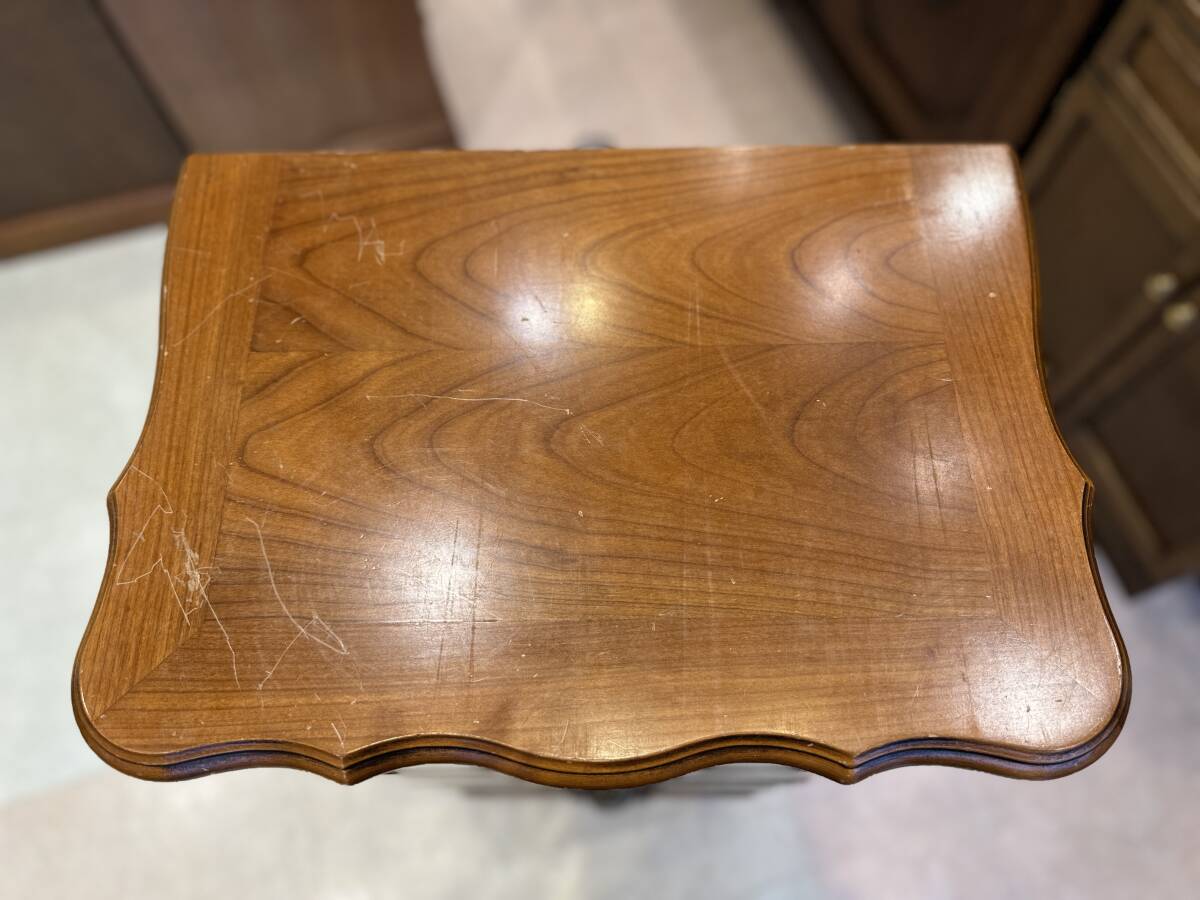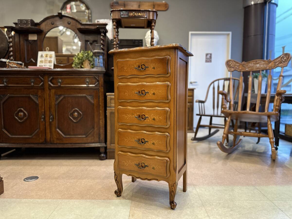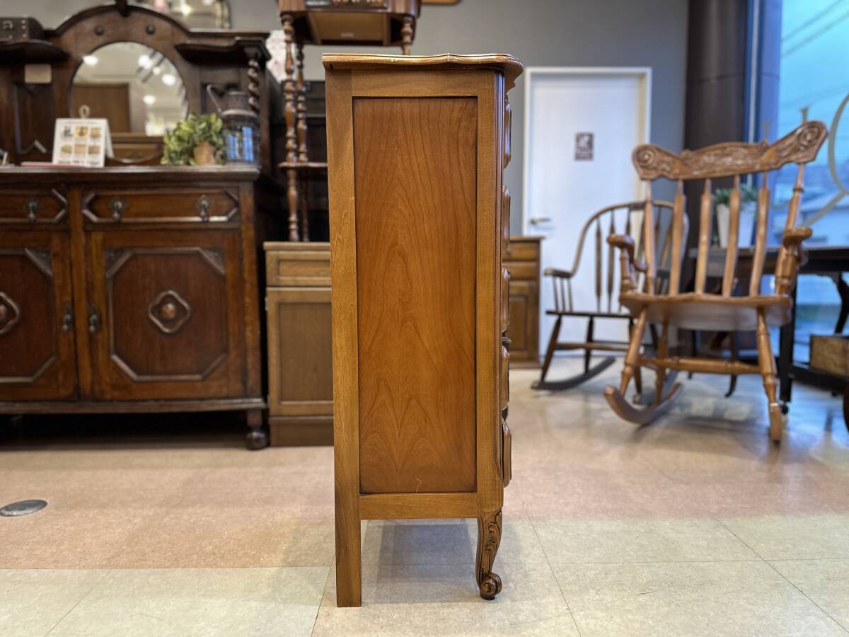 象嵌(ぞうがん)は、「インレイ」と呼ばれ 一つの素材に異なった素材を嵌め込む技法のことを言います。 もともと象は「かたどる」嵌は「はめる」という意味があります。 象嵌には金属象嵌や大理石象嵌などありますが 中でも木製象嵌はとても繊細で美しく、まるで芸術品のようです。 木を薄くカットして細工を行うため 収縮のしないウォールナット材やマホガニー材などの上質な素材の家具にのみ この技法が使われています。 そのため、象嵌が装飾された家具は貴重で高価なものが多くみられます。 【商品状態】 天板等に引っ掻き傷があります。 使用感がありますので写真にてご確認下さい。 引き出しはスムーズに開け閉め出来ます。 気になるような匂いもありません。 【商品詳細】 サイズ: W 495 D 345 H 975 【発送】 ヤマト運輸らくらく家財便での発送となります。 サイズランク: Bランク -=--=-=-=-=-=-=-=-=-=-=-=-=-=-=-=-=-=-=-=-=-=-=-=-=-=-=-=-= 【取引詳細】 ・落札後のキャンセルはお受けできません。 ・支払いはヤフーかんたん決済のみとなります。 ・配達日、時間のご指定がある場合は落札後、お支払い前にご連絡下さい。 地域によっては時間指定ができない場合もございますのでご了承下さい。 配達日時のご指定のない場合は最短での配達となります。 大きなサイズの商品については予め搬入経路のご確認をお願い致します。 吊り上げ等の作業が必要な場合はお客様のご負担となります。 ・返品はお受けできません。 ・中古品の為、欠損やダメージの見落とし等ある場合がございます。 写真に載っていない・説明に書いていないなどの理由での返品も原則応じかねます。ご理解頂いた上でのご入札をお願い致します。 ・商品について気になる事がありましたら、お気軽にご質問下さい。 ・即決、値引きについての質問にはお答えできません。 ・オークションの取消 出品中の商品は店頭販売も行っております。 店頭で販売された商品については取消、取引のキャンセルを 行う場合がございますので予めご了承下さいませ。 ■■■お願い■■■ ・落札後、24時間以内にご連絡お願い致します。 ・直接のお引取ご希望の場合はその旨ご連絡下さい。 ・ヤフオク仕様変更により、こちらからお客様お電話番号が見えなくなっております。 ヤマト依頼時に必須になりますのでお客様のお電話番号をお知らせ下さいませ。 ■■■発送方法■■■ ・送料は元払いで発送致します。 ・送料は落札者様負担となります。 *上記の内容をご理解頂き納得の上 入札をお願い致します。 -=--=-=-=-=-=-=-=-=-=-=-=-=-=-=-=-=-=-=-=-=-=-=-=-=-=-=-=-= アンティーク家具や雑貨を取り扱っている店舗より出品をしております。 ヤフーオークションへの出品は一部商品となっておりますので 機会がございましたら店舗へのご来店をお待ちしております。 静岡県伊東市吉田 142 SNSにて入荷商品や、店内の様子を紹介しております! 下記のアカウントで検索してみてください♪ Instagram:@aston_antiques TikTok:@aston_antiques -=--=-=-=-=-=-=-=-=-=-=-=-=-=-=-=-=-=-=-=-=-=-=-=-=-=-=-=-= ■■■当店ホームページ■■■ https://aston-recycle.jp/ ホームページに店舗のご案内が掲載されていますのでご覧下さい。 | |||